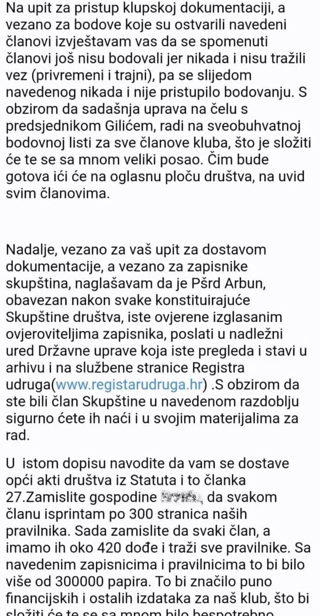 "Što god smo zatražili, koji god podatak, jednostavno dobijamo odgovore da neće oni printati papire, slati nam dokumente već da se sami snalazimo. Jednostavno su se začahurili. Putem e-maila je dobio odgovor samo jedan član kojemu je rečeno da bude kurir pa nama odgovara pojedinačno. Naravno da nije pristao na to već je zatražio službeni pristup u komunikaciji. Između ostalog, taj odgovor je sramotan, sadrži dosta pogrešnih podataka i lijepo se vidi nonšalantan, gotovo bezobrazan ton", potvrđuje Dešković da im je pristup podacima zabranjen, pa su tako i za novog člana uprave, Matu Leticu, saznali nakon više od mjesec dana.