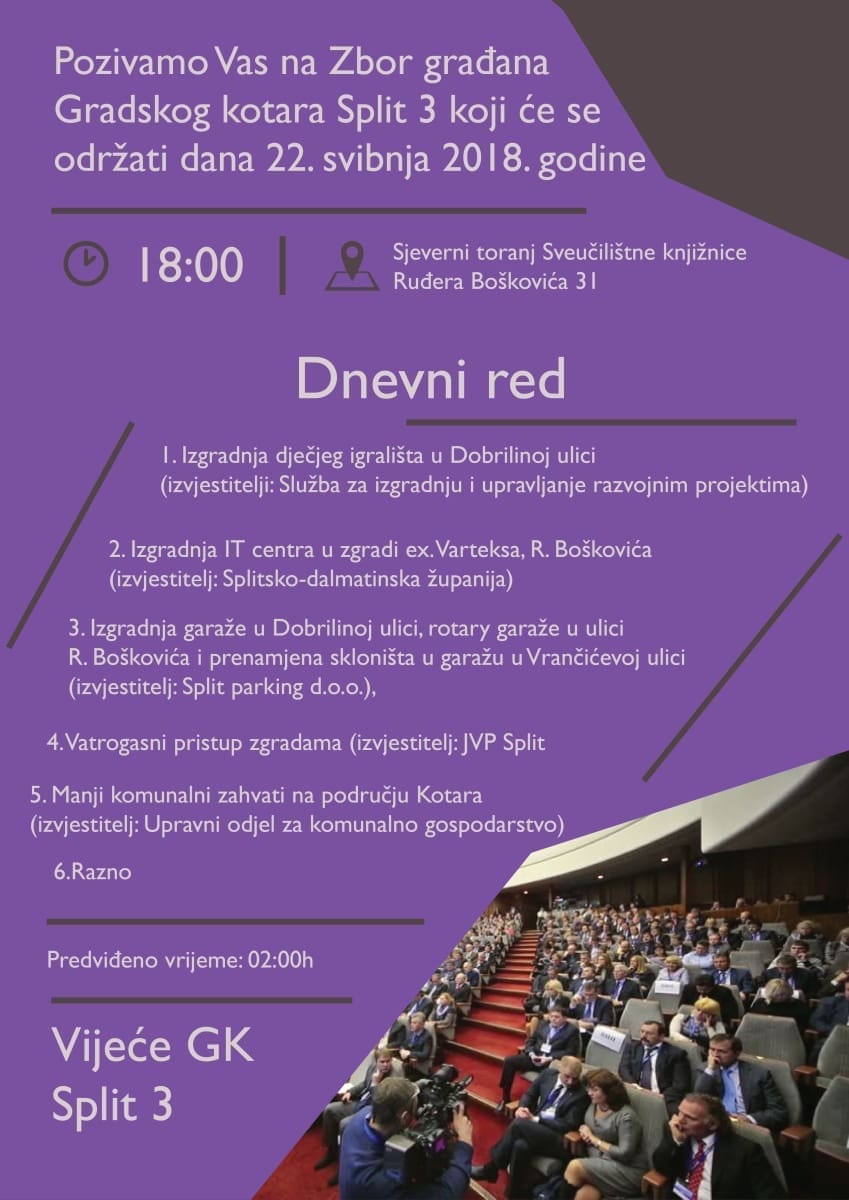 "Povodom proslave Dana Gradskog kotara Split 3 - "Ruđerijade", Vijeće Gradskog kotara poziva Vas na Zbor građana koji će se održati dana 22. svibnja 2018. godine (utorak) s početkom u 18h u prostorijama sjevernog tornja Sveučilišne knjižnice, a kako bi se upoznali s najavljenim projektima, gradskim i županijskim službama i upitali ono što Vas osobno najviše zanima.