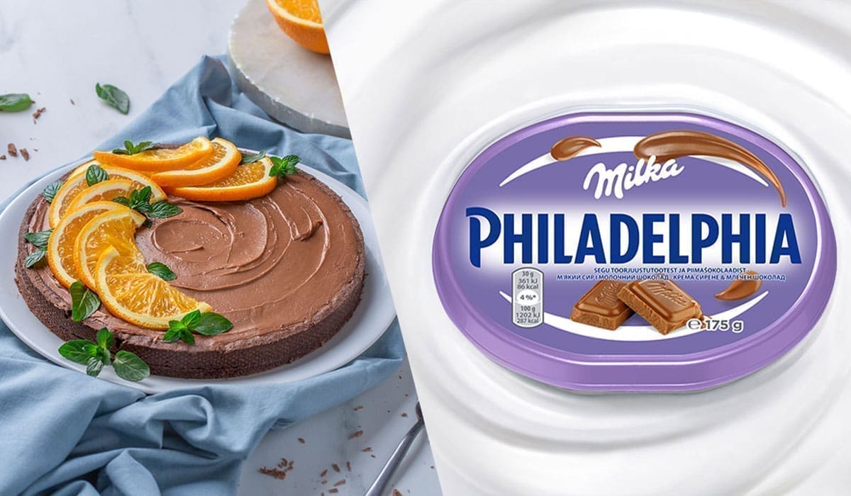- Na pečenu podlogu stavite krem sir Philadelphia Milka. Ukrasite tart kriškama naranče i listićima mente.