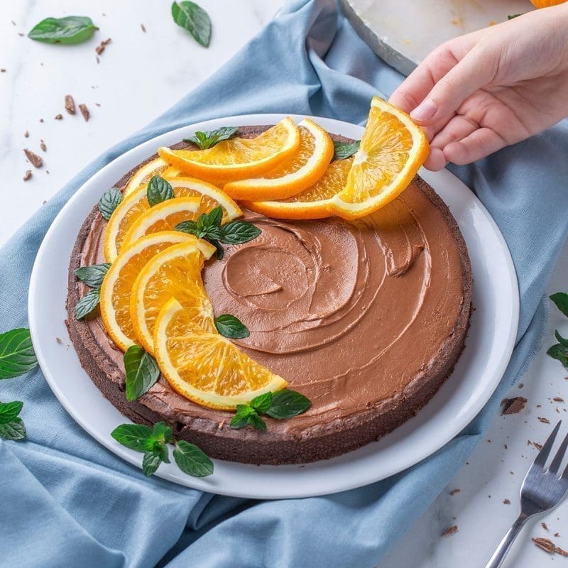 - Na pečenu podlogu stavite krem sir Philadelphia Milka. Ukrasite tart kriškama naranče i listićima mente.