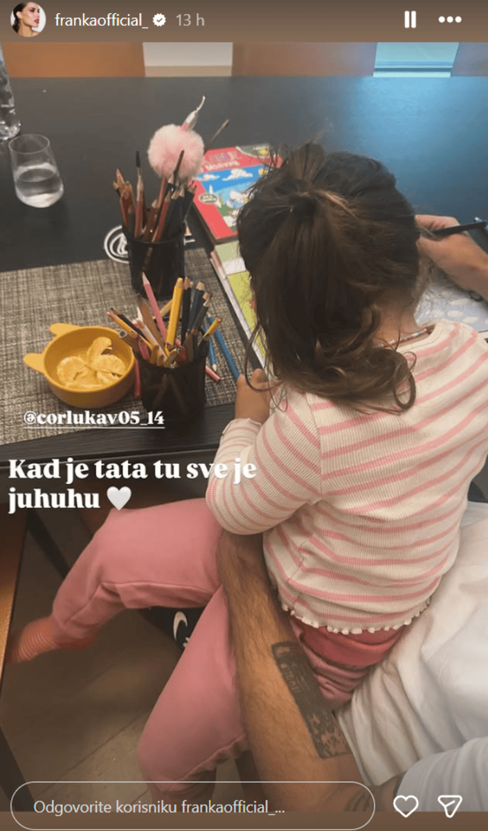 ''Kad je tata tu sve je juhuhu'', napisala je Franka uz preslatki prizor, čime je jasno dala do znanja koliko njezina kći uživa u svakom trenutku provedenom s tatom, piše Dnevnik.hr.