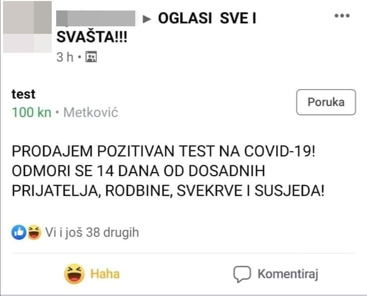 "Prodajem pozitivan test na COVID-19! Odmori se 14 dana od dosadnih prijatelj, rodbine, svekrve i susjeda" - napisao je muškarac. Svoju ponudu procijenio je na 100 kuna.