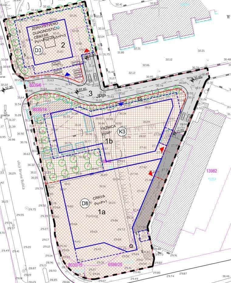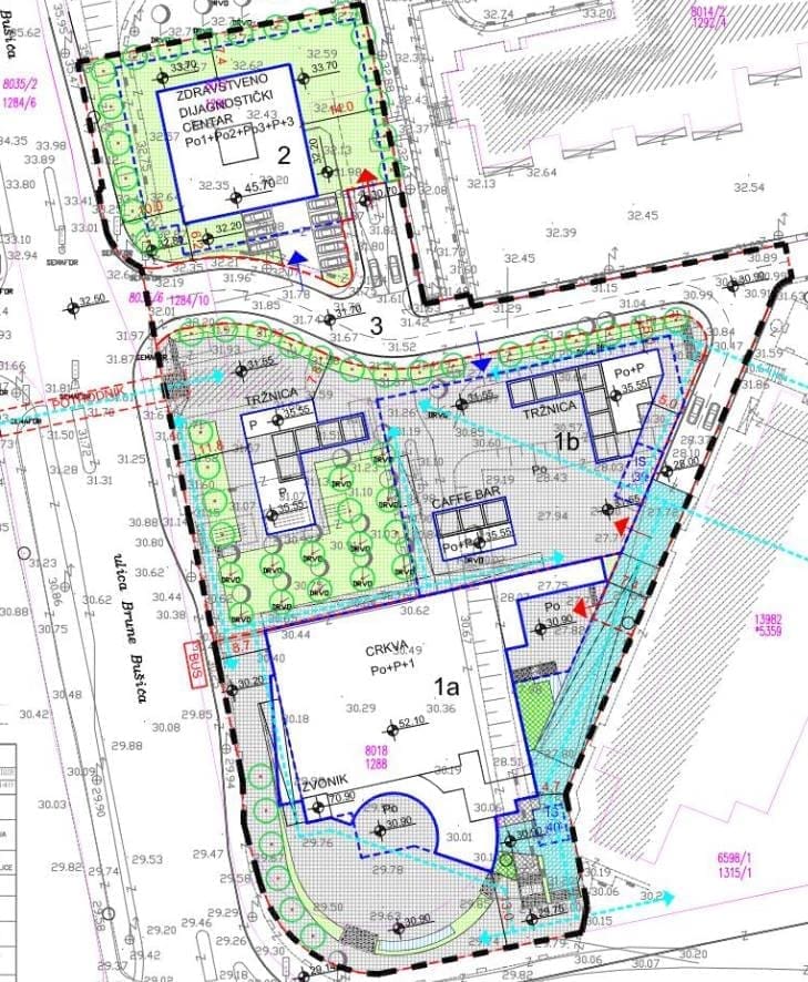 Tržnica je povećana u odnosu na prije (680 m2 : 571m2), a kafić se više ne navodi kao zasebna cjelina. Crkva ostaje na istom mjestu iste kvadrature, ali nema više kota jer se mora provesti arhitektonski natječaj za odabir idejnog rješenja (nadajmo se da će to ipak biti skromnije zdanje od onog megalomanskog). Zdravstveni centar je nepromijenjen.
