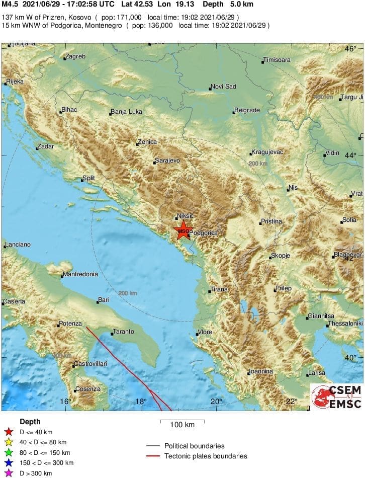 Magnituda potresa iznosila je 4.5 po Richteru, a epicentar je bio 15 kilometara sjeverozapadno od Podgorice, na dubini od 5 kilometara.