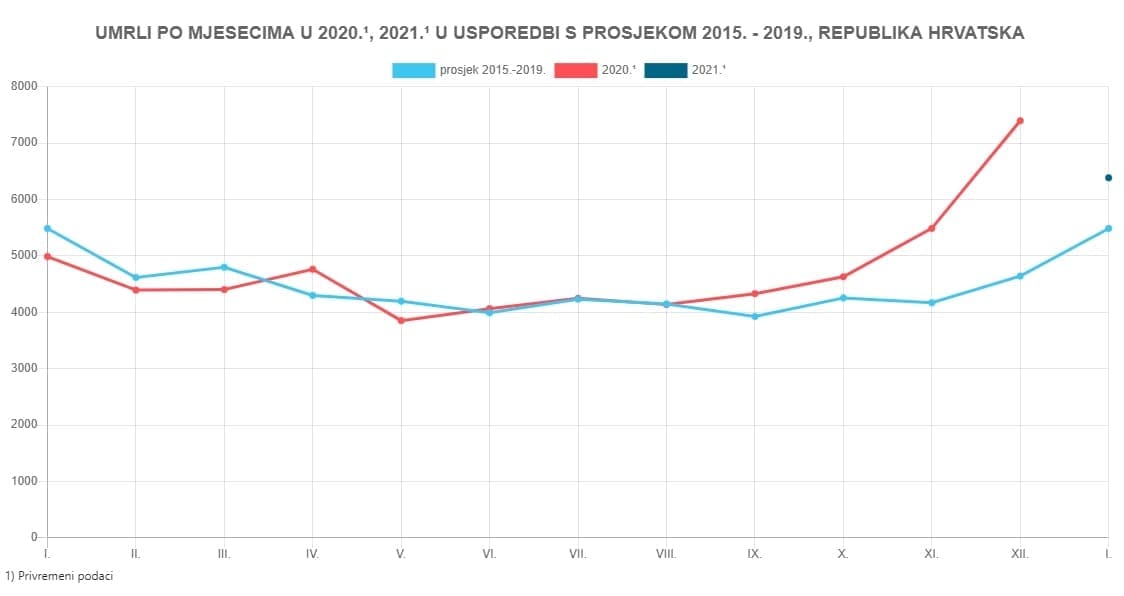 Prema privremenim podacima koje je objavio Državni zavod za statistiku, u Republici Hrvatskoj u siječnju 2021. bilo je 6.383 umrlih. Broj umrlih u siječnju 2021. porastao je za 16,4%, odnosno bilo je 898 umrlih više u odnosu na petogodišnji prosjek (2015. − 2019.) za isti mjesec.