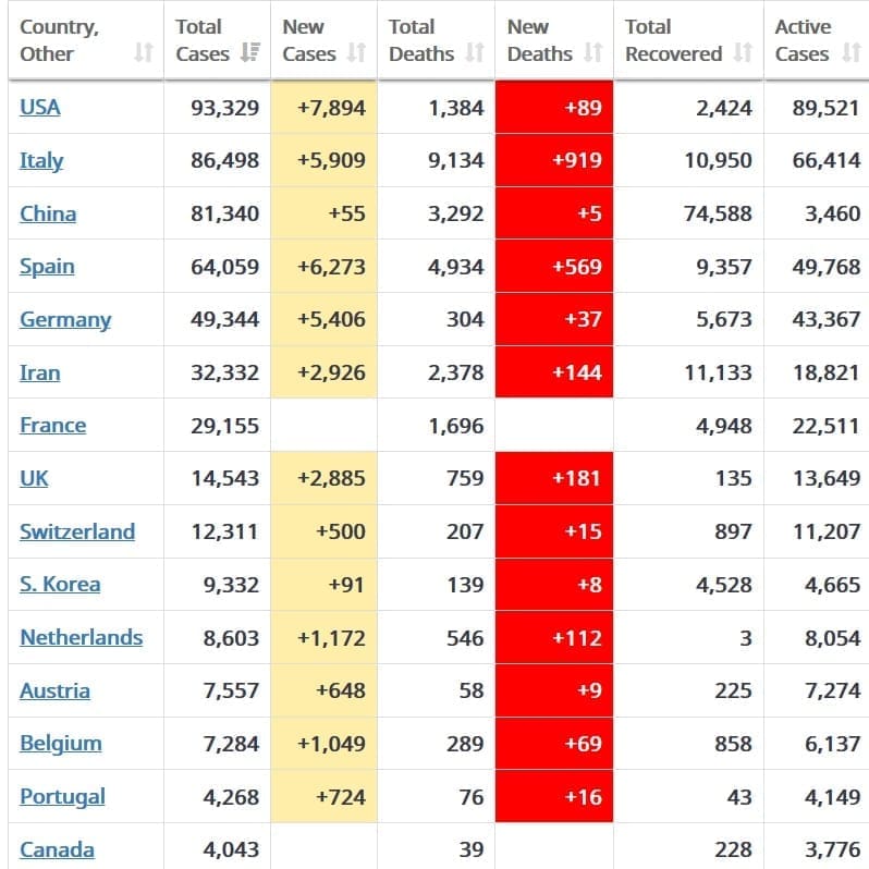 Najviše zaraženih u svijetu zadnja 24 sata zabilježeno je u SAD-u, 7.894, no večeras će taj broj vrlo vjerojatno narasti. Umrlo je 89 osoba, što znači da je smrtnost zasad znatno niža nego u Italiji.