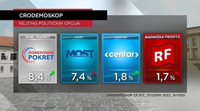 Od suprotstavljanja Vladi, svog plana i programa za Vukovar profitirao je Domovinski pokret (studeni 8,4 posto - listopad 7,5 posto) preskočio je MOST (studeni 7,4 posto - listopad 8,2 posto). Uz pad MOST je na petom mjestu, a svi ostali su daleko, ispod 2 posto. Centar (studeni 1,8 posto - listopad 1,7 posto), Radnička fronta (studeni 1,7 posto - listopad 1,8 posto).