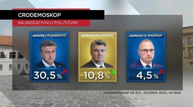 Nitko se ne želi naći na ljestvici najnegativaca, ali neprestižno prvo mjesto drži premijer Plenković (studeni 30,5 posto - listopad 30,3 posto), bira ga više od 30 posto ispitanika. Drugi je predsjednik Milanović (studeni 10,8 posto - listopad 13,1 posto) kojeg znatno rjeđe negativno ocjenjujete. Evo i šefa diplomacije koji se, očito zbog košarice u pokušaju poljupca njemačkoj kolegici, ovoga mjeseca našao na trećem mjestu (studeni 4,5 posto - listopad 4,1 posto).