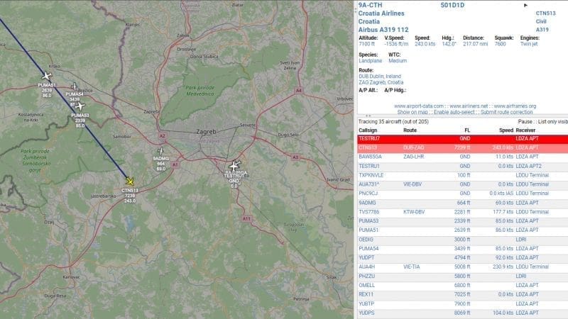 Zrakoplov Croatia Airlinesa A319-112 (reg. 9A-CTH na letu OU513/CTN513) iz Dublina za Zagreb po ulasku u zračni prostor Austrije ostao je bez komunikacija sa kontrolom letenja te je postavio transponder kod 7600-Radio failure (lost communications), javlja portal Avioradar.