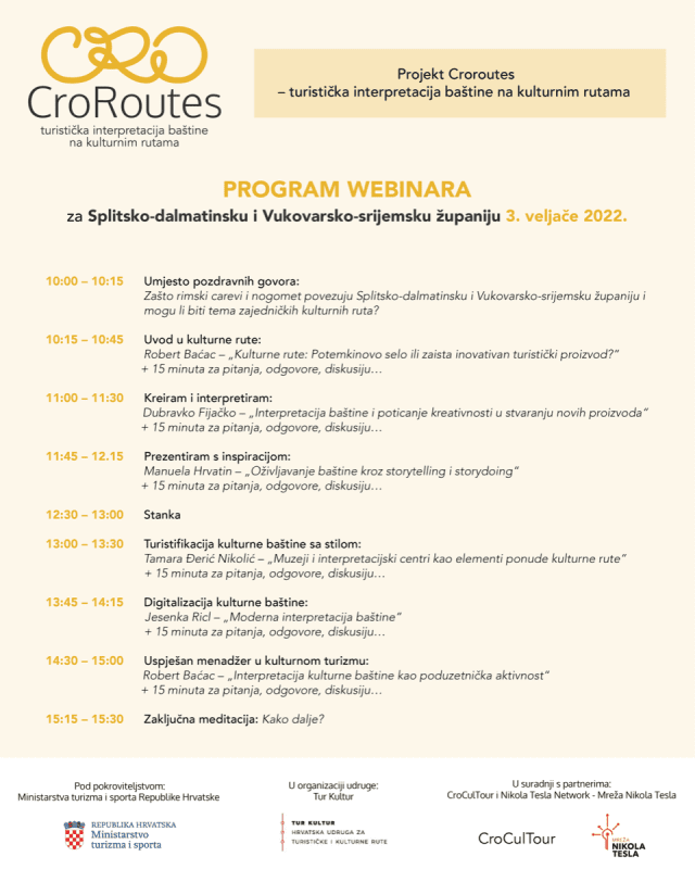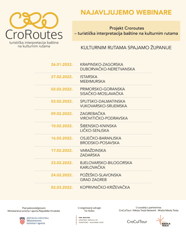 Tema je webinara koji se održava 3. veljače 2022. od 10.00 do 15.30 sati, za Splitsko-dalmatinsku i Vukovarsko-srijemsku županiju , u organizaciji Hrvatske udruge za turističke i kulturne rute Tur Kultur i projekta "CroRoutes - turističke interpretacije baštine na kulturnim rutama", pod pokroviteljstvom Ministarstva turizma i sporta Republike Hrvatske, u suradnji s partnerima CroCulTour i Nikola Tesla – Mreža Nikola Tesla.