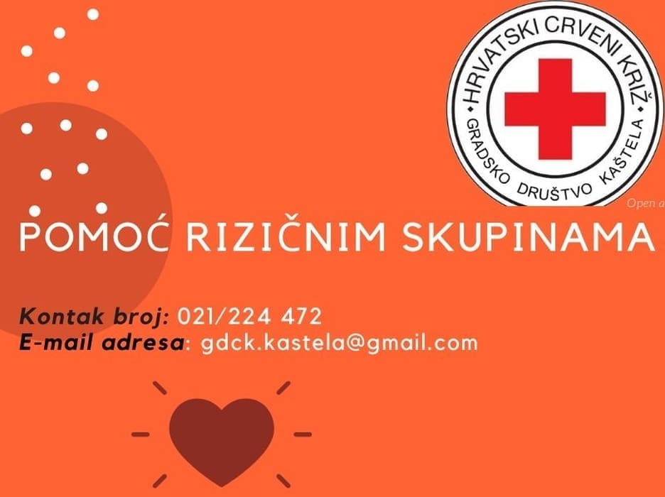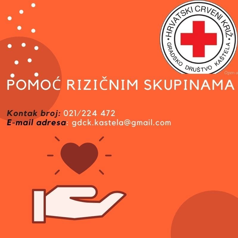 Gradsko društvo Crvenog križa Kaštela u skladu s mogućnostima i potrebama građana organizirat će dostavu osnovnih prehrambenih i higijenskih potrepština osobama koje su u najvećem riziku od obolijevanja.