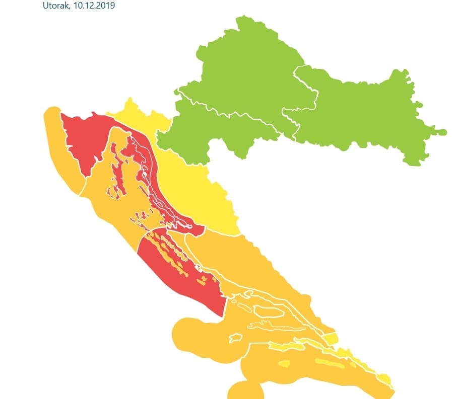 DHMZ je za danas, unutar sustava MeteoAlarm, za veći dio Jadrana izdao narančasti stupanj upozorenje zbog snažne bure, za sjeverni i dio srednjeg Jadrana, crveni, najviši stupanj upozorenja.