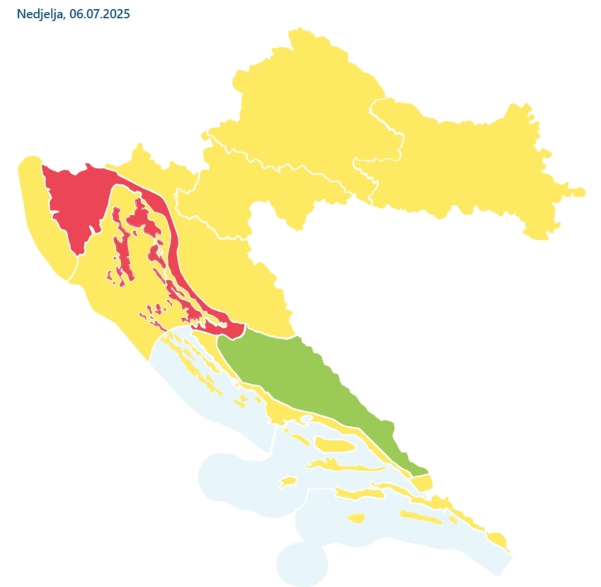 Danas, 6. srpnja od 16 sati moguće je vrlo jako olujno nevrijeme na području cijele Istre s mogućnošću širenja na Rijeku i Kvarner (posebice otoke). Vrlo jak i olujni vjetar (jugozapadnjak i sjeverozapadnjak), moguća jaka grmljavina, kiša i tuča.