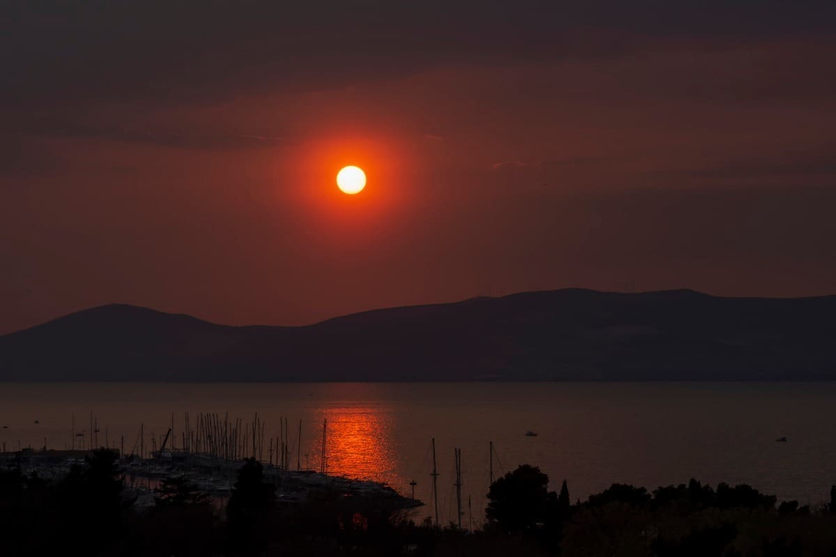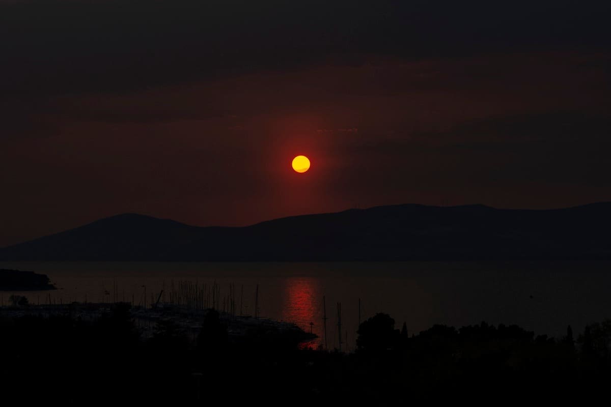 Današnja crvena boja sunca za vrijeme zalaska posljedica je prisutnosti dima s požarišta na planinama u Zagori, ali i susjedne BiH. Međutim stanje požarišta u Zagori jenjava, stoga se i koncentracija dima smanjila.