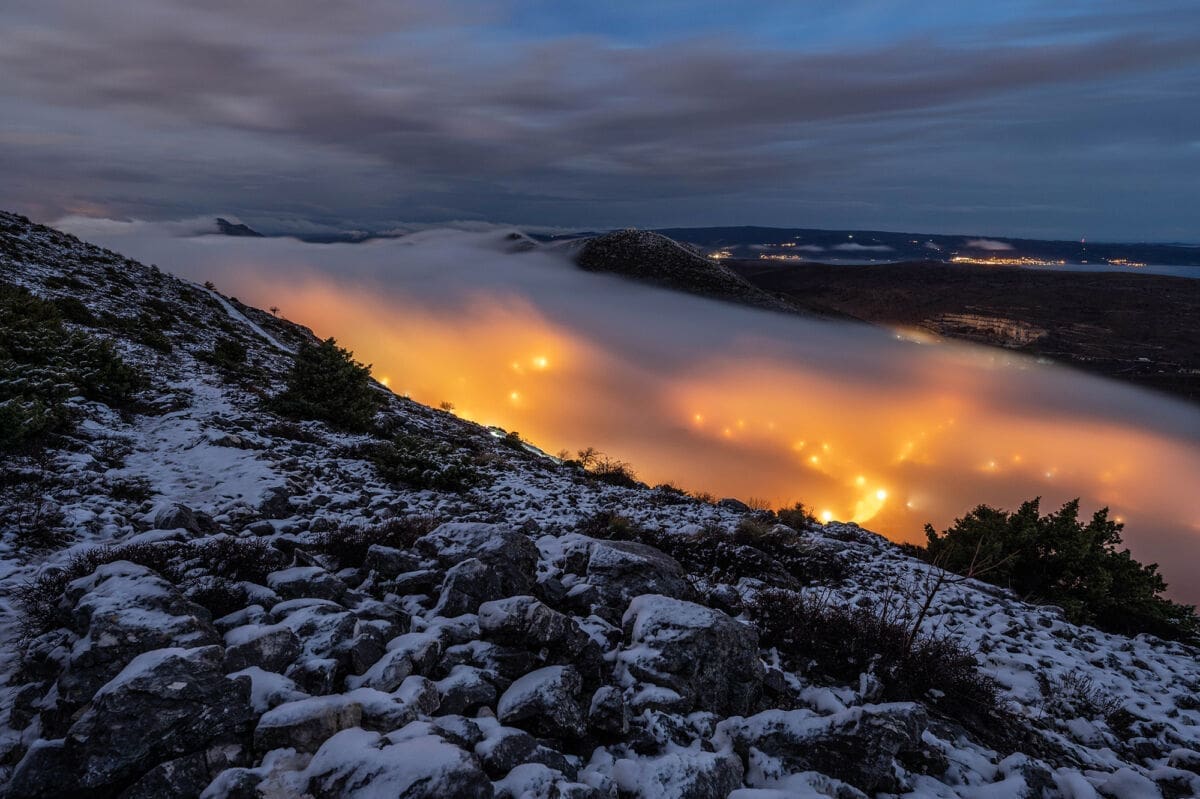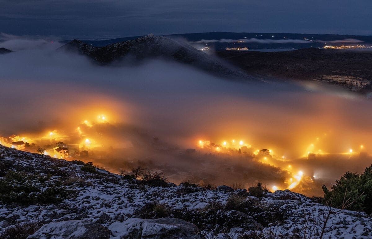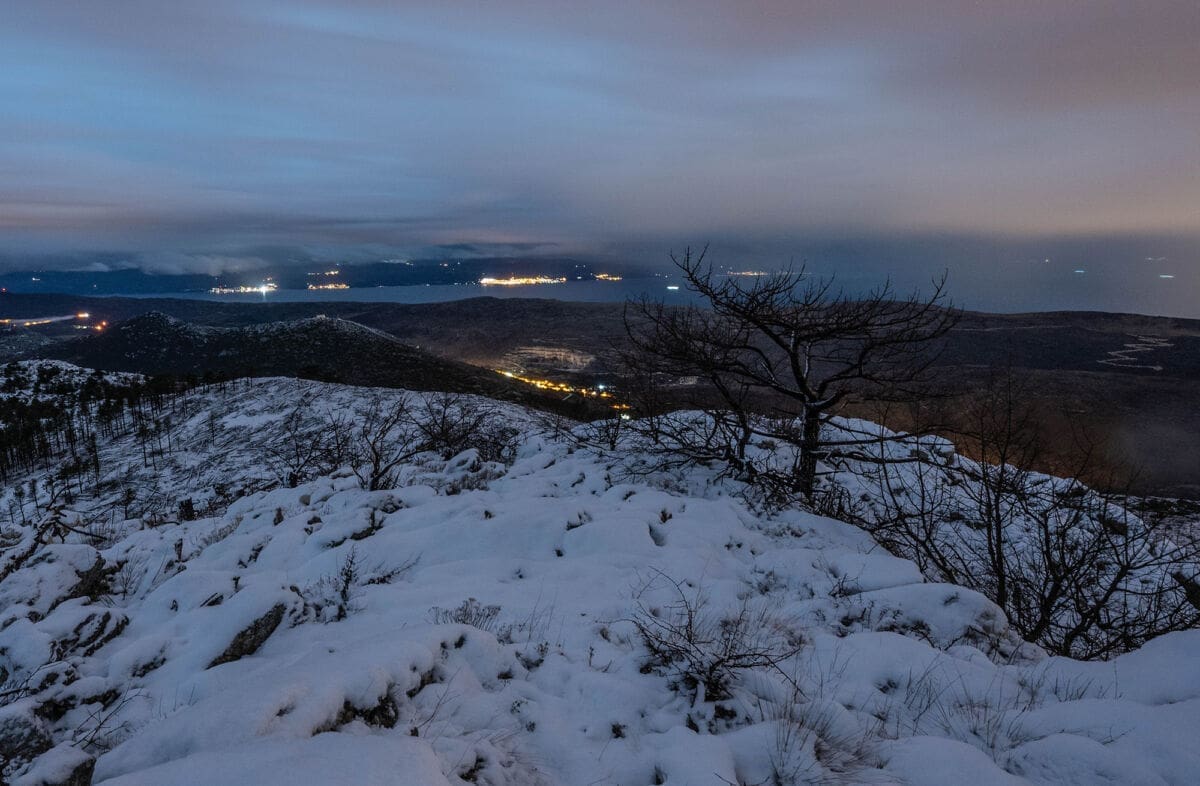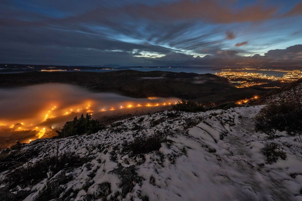 Mi vam donosimo fotogaleriju upravo s Mosora, gdje prvo možete vidjeti naselje Gornje Sitno koje je u utonulo u maglu, pogled na Split, a potom i snježne fotografije iz viših predjela planine...