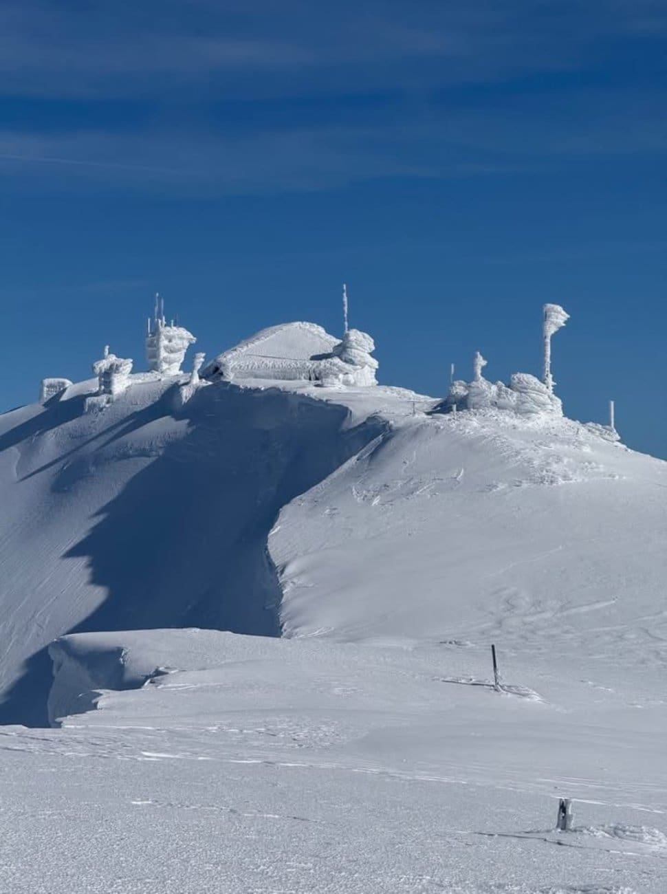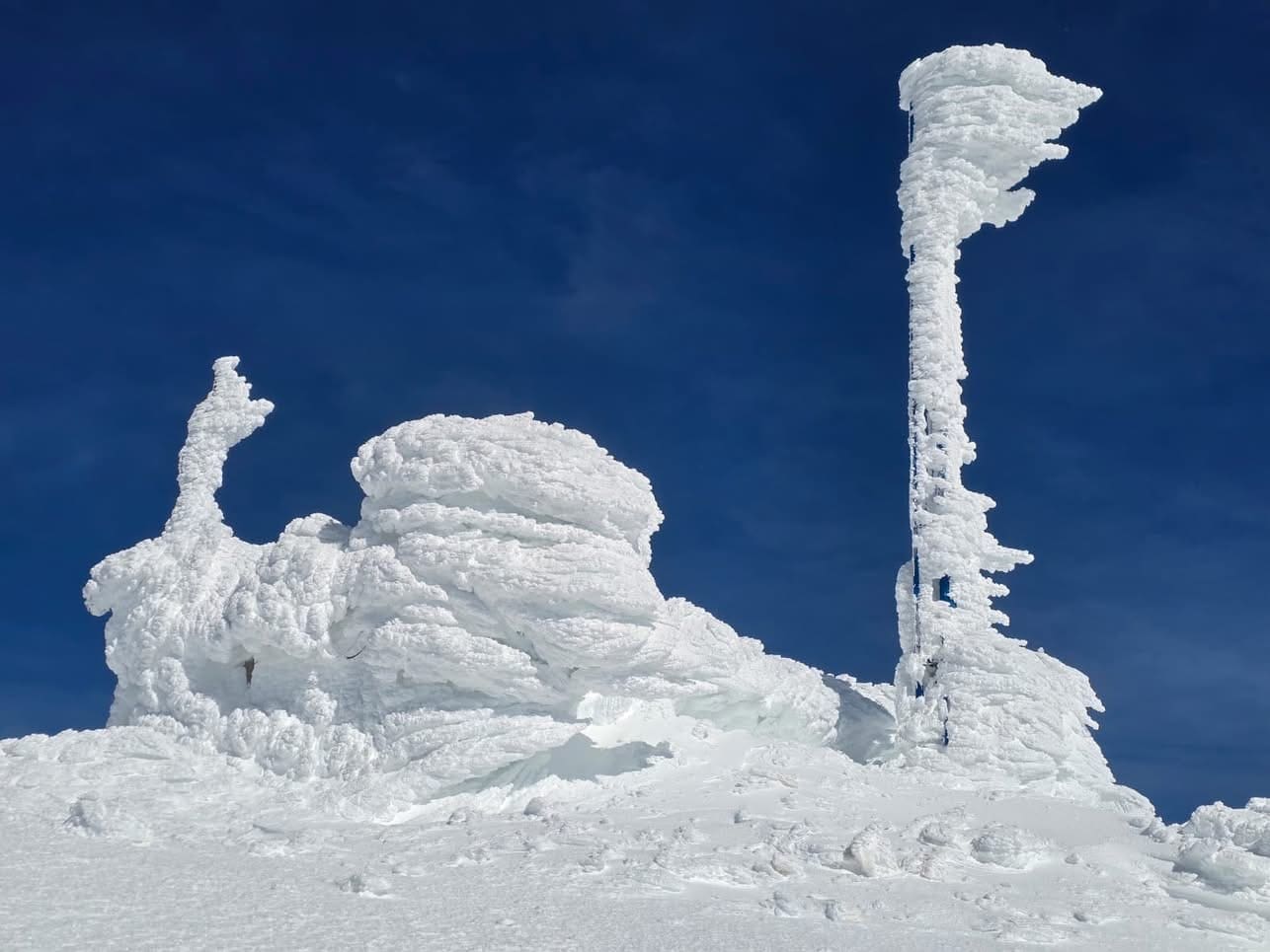 Fotografije s vrha prikazuju gotovo potpuno zaleđene antene, stupove i objekte postaje, prekrivene debelim slojevima snijega i leda. Pojedine konstrukcije oblikovane su snažnim vjetrom u impresivne snježne formacije, što jasno pokazuje koliko su uvjeti na toj nadmorskoj visini ekstremni.