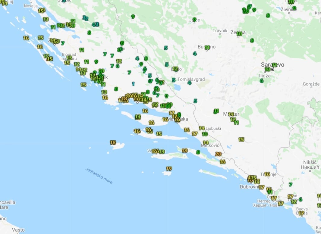 Prohladno je bilo i drugdje u Zagori, posvuda ispod 10 stupnjeva, a uz Peruću i ispod 5°C. Na obali je najnižih 8 stupnjeva izmjereno u Potomju na Pelješcu, a drugdje je bilo od 10 do 18°C.