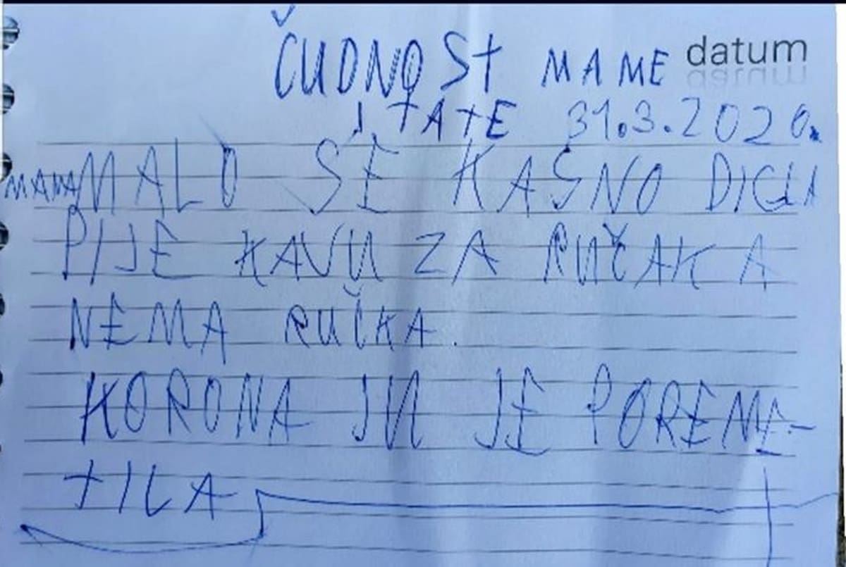 Popularna FB stranica Dnevna doza prosječnog Dalmatinca, objavila je kratki pisani uradak jednog djeteta koje opisuje kako to izgleda kada su mama i tata kod kuće u vrijeme korone pod nazivom 'Čudnost mame i tate'.