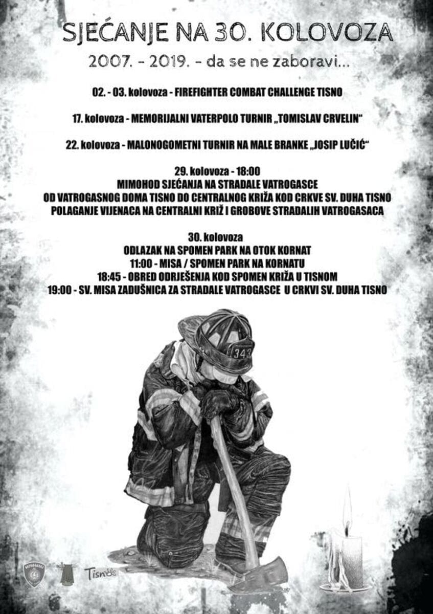 Mimohod sjećanja započet će u 18 sati ispred vatrogasnog doma DVD-a Tisno polaganjem vijenaca na spomen ploču, nakon čega će se krenuti prema mjesnom groblju Sv. Duha u Tisnome gdje će biti položeni vijenci na spomen križu stradalim vatrogascima.