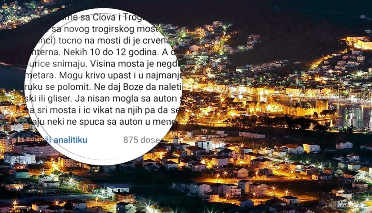 "Drage mame s Čiova i Trogira. Dica skaču s novog Trogirskog mosta (nisu stranci). Točno na most gdje je crvena lanterna. Nekih 10 do 12 godina, a dvije curice sve to snimaju. Visina mosta je negdje pet metara. Naime, mogu krivo upast i u najmanju ruku se polomiti. Ne daj Bože da naleti jet ski ili gliser... Ja nisam mogla s autom stati na sred mosta i vikati na njih jer sam se bojala da će se netko 'spucati' u mene", napisala je na društvenim mrežama u jednoj popularnoj Facebook grupi.