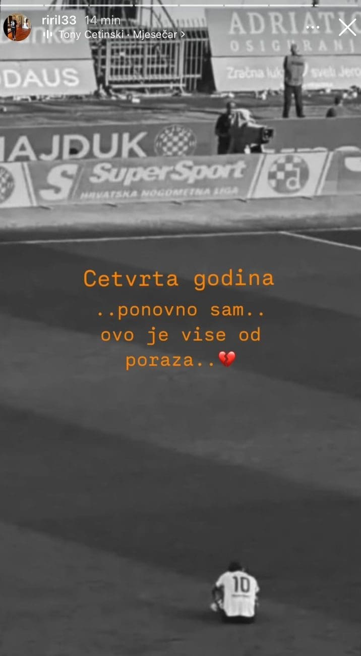 "Četvrta godina, ponovno sam... Ovo je više od poraza", stoji u poruci uz fotografiju utučenog Marka Livaje koji sjedi na poljudskom travnjaku, popraćenu pjesmom Tonyja Cetinskog – Mjesečar.