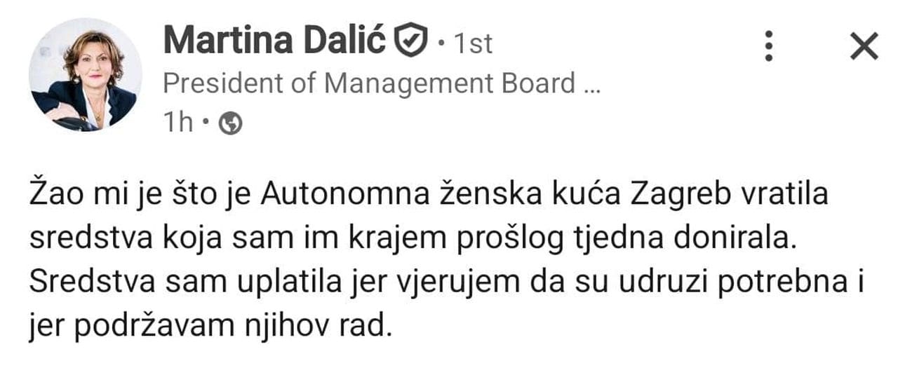Dalija Orešković ponovno se oglasila na društvenim mrežama, ovoga puta komentirajući donaciju Martine Dalić Autonomnoj ženskoj kući Zagreb.
