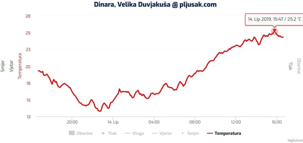 Na automatskoj meteo postaji Velika Duvjakuša na Dinari (1680 metara nadmorske visine) danas je temperature dosegla vrlo toplih 25,2°C. Dakle, ako ste se danas poželjeli rashladiti u najvišem gorju Hrvatske, vjerojatno ne bi uspjeli u toj zamisli.