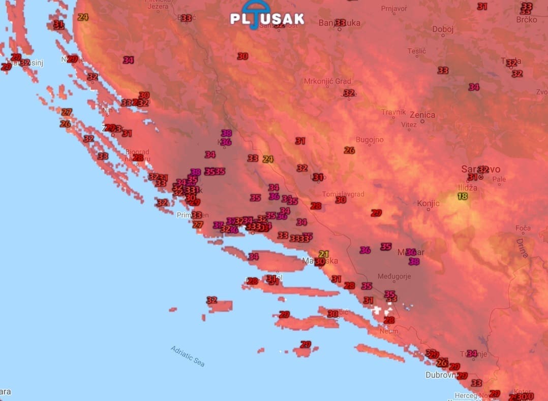 Na sjevernom Jadranu je bilo većinom od 30 do 34°C.