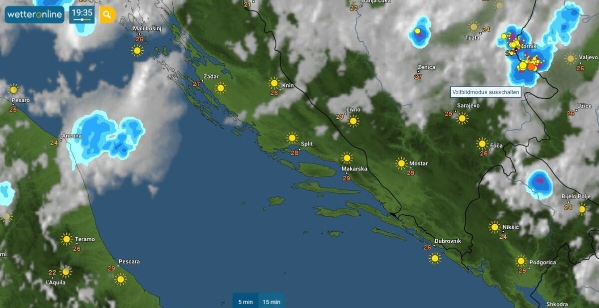19:41 - Dalmacija uživa u pretežno vedrom i toplom vremenu, idealnom za praćenje na otvorenom. Malo brige može imati tek zadarsko područje jer jedna nakupina oblaka stiže s mora prema krajnjem sjeveru Dalmacije