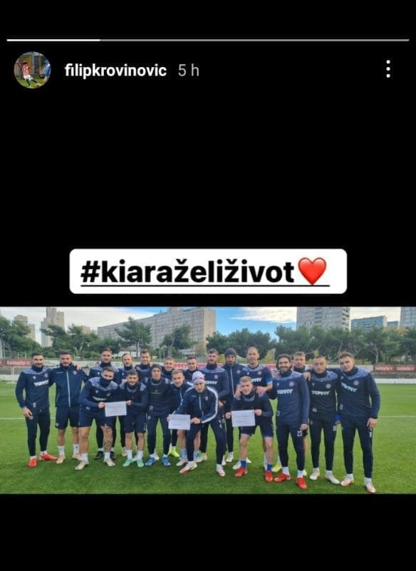 Nakon pobjede nad Dinamom odlična atmosfera vlada među igračima Hajduka. Ipak pripreme za sljedeću utakmicu su već u jeku, a ni to nije omelo igrače da se uključe u humanitarnu akciju koja je ujedinila cijelu Dalmaciju. "Kiara želi život poručuju naši igrači s terena od života. Priključite se akciji, pomozimo Kiari", piše HNK Hajduk na Facebooku. Akciju je podijelio i Filip Krovinović preko Instagram "priče" sa slikom Hajdukovaca s natpisom "Kiara želi život."
