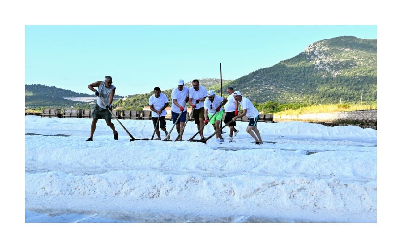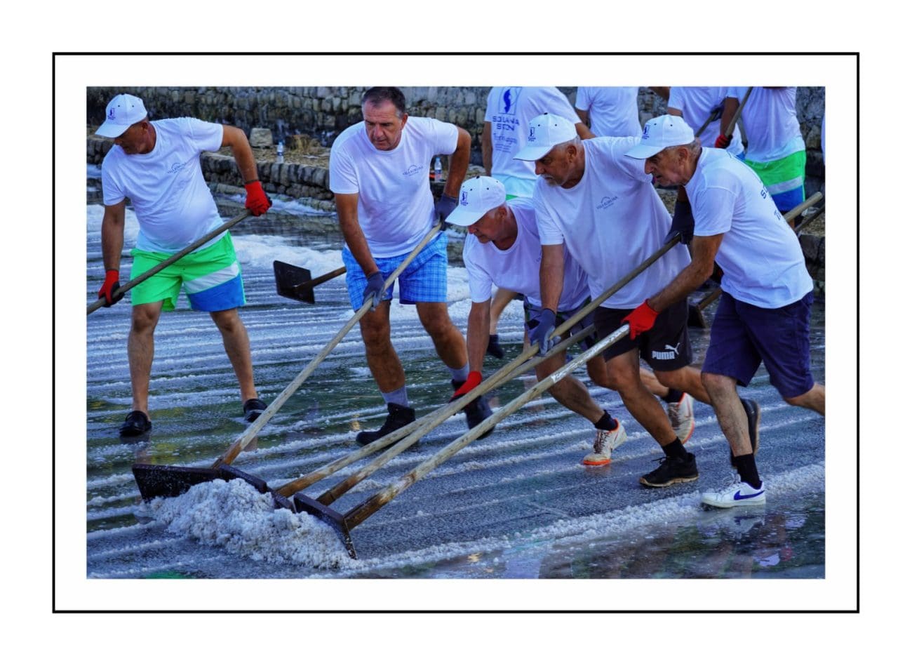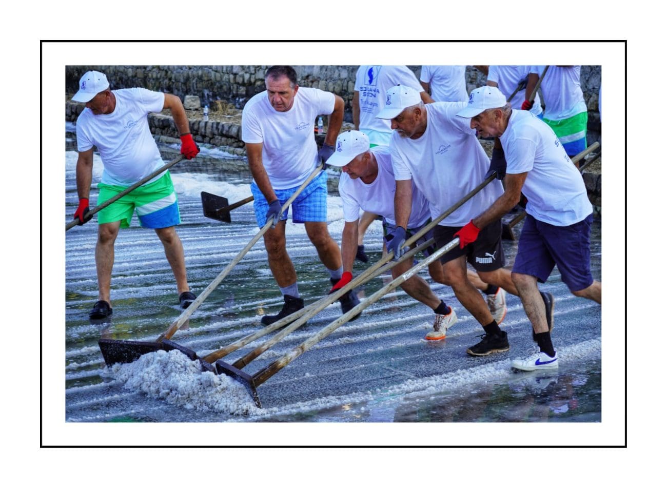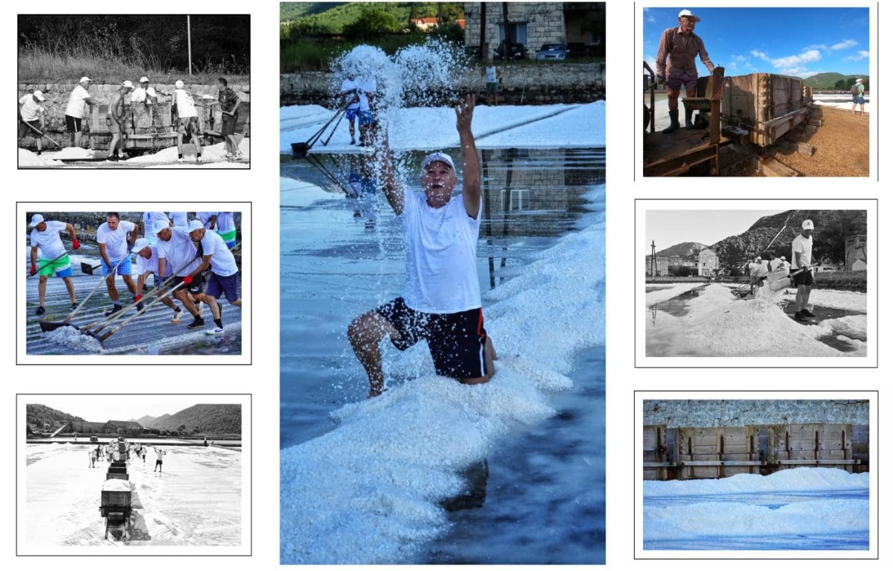 Slika je gotovo ista kakva je bila i prije nekoliko stotina godina: muškarci u bijelim majicama i kapama ulaze u bazene i lopatama skupljaju sol, potom je prenose u stare drvene vagone. Težak, ali ritmičan rad, popraćen osmijesima i zajedništvom, vraća u život duh vremena kada je sol bila “bijelo zlato” i čuvala bogatstvo Dubrovačke Republike.