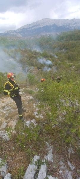 Na intervenciji gašenja požara tijekom jučerašnjeg dana angažirano je ukupno 57 vatrogasaca sa 23 vatrogasna vozila iz IVP Šibenik, IVP Split, JVP Knin te izvanredna dislokacija iz Karlovačke županije. Pored zemaljskih snaga, tijekom dana požar je gasio jedan protupožarni zrakoplov Canadair CL-415. Tijekom noći na požarištu su angažirani vatrogasci iz IVP Šibenik, IVP Split i JVP Knin s ukupno 13 vatrogasaca i 6 vatrogasnih vozila. Prilikom gašenja požara jedan vatrogasac je zadobio ozljedu glave te je zbrinut od strane HMP. Ozlijeđeni vatrogasac je pripadnik DVD-a iz Karlovačke županije – izvanredne dislokacije.