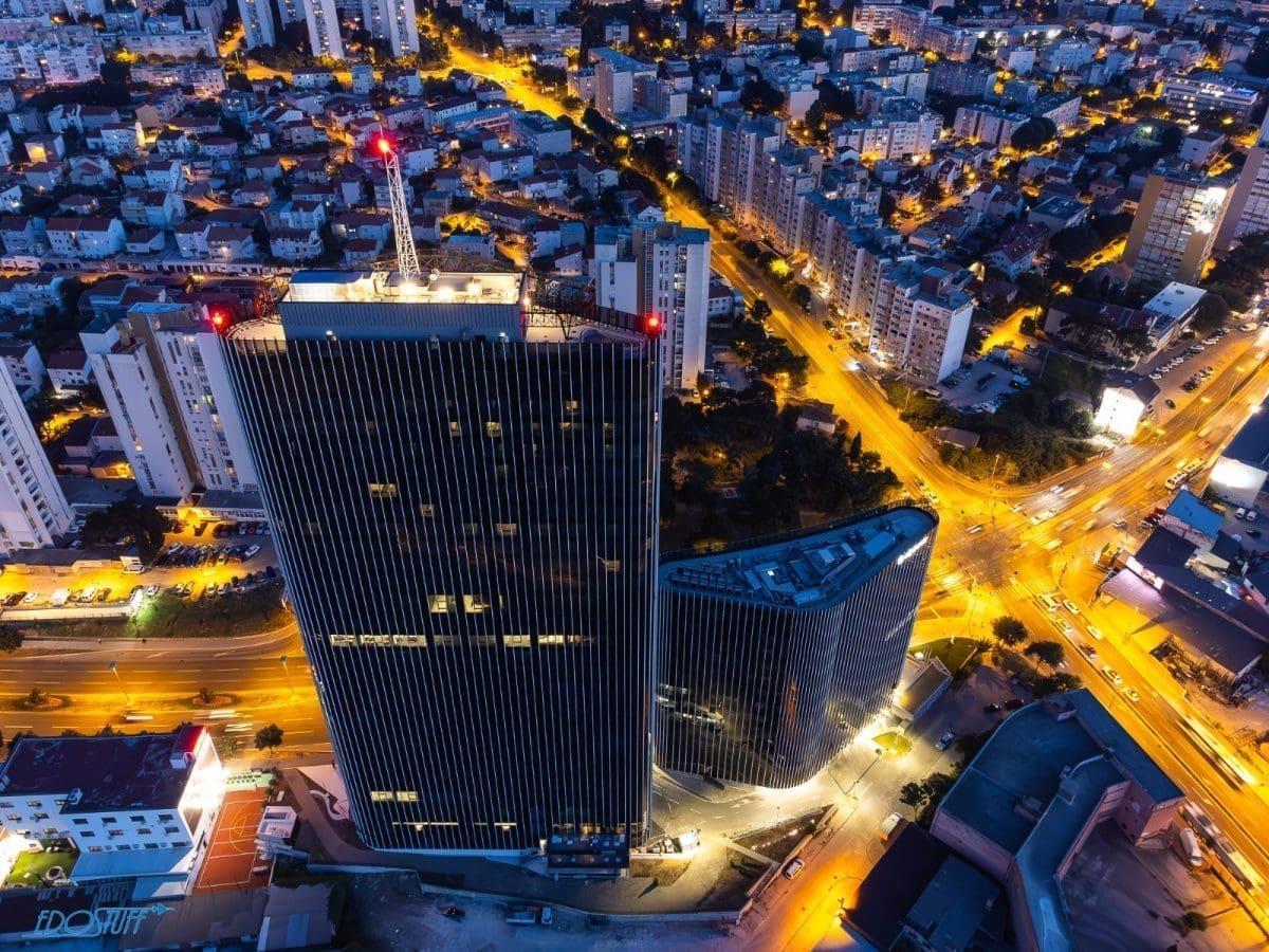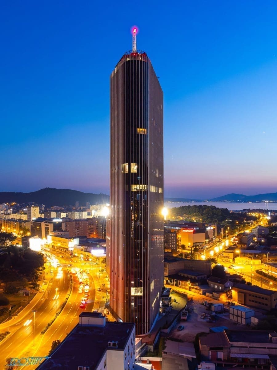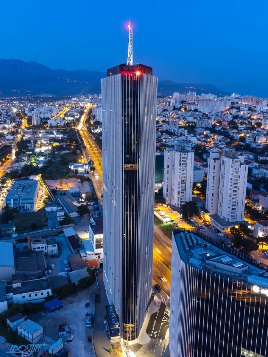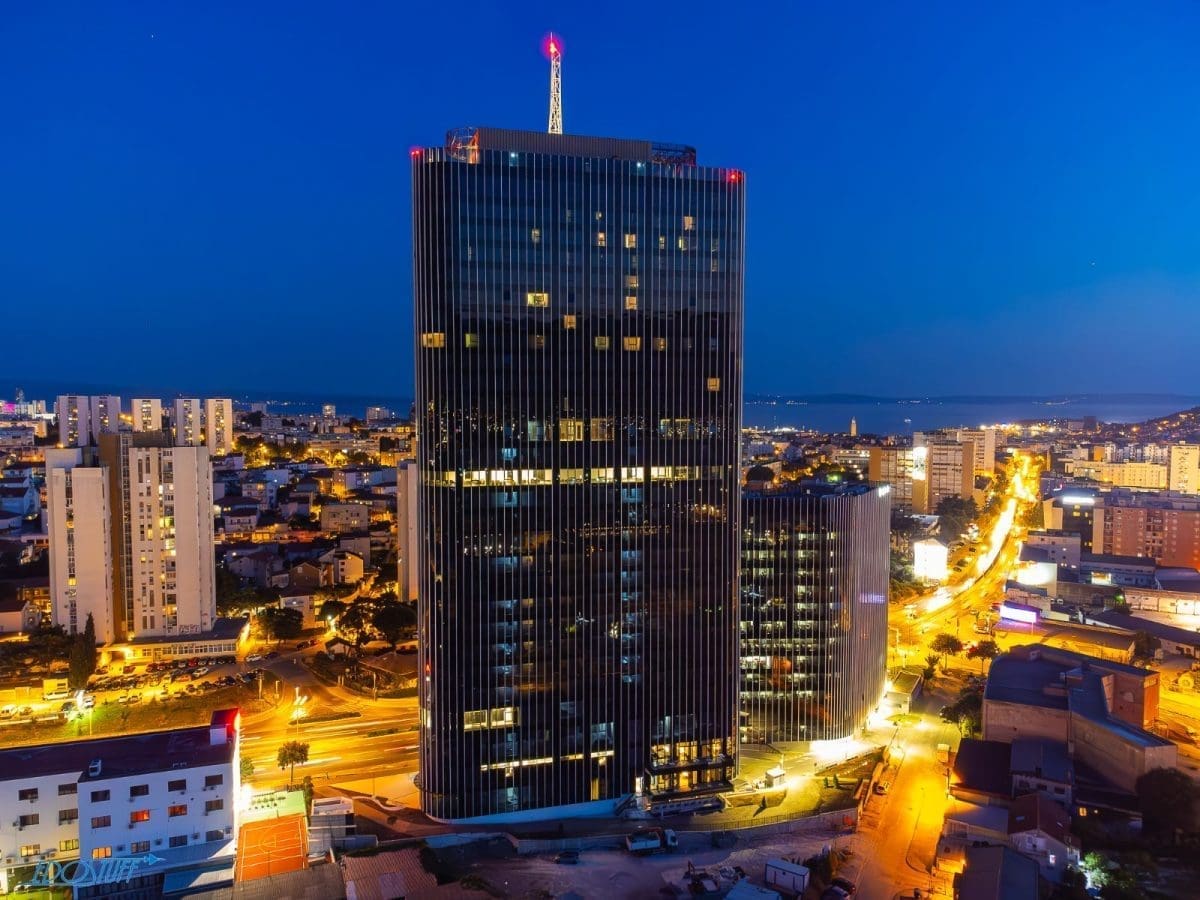 Službeno najviša građevina u Hrvatskoj nedavno je dobila noćno osvjetljenje. Zgrada u kojoj će poslovati Marriot hotel dala je potpuno novu vizuru gradu pod Marjanom.