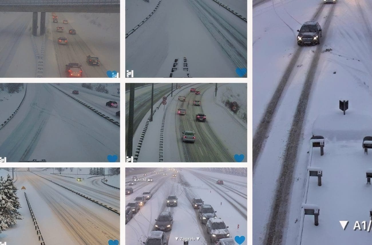 Snijeg i niske temperature jutros su znatno zakomplicirali promet u većem dijelu Hrvatske, a zimski uvjeti posebno se osjećaju na autocesti A1, poznatijoj kao Dalmatina. Kao što se vidi i na fotografijama s nadzornih kamera, kolnici su mjestimice prekriveni ugaženim i razmočenim snijegom, vidljivost je smanjena, a promet se odvija usporeno uz izražene tragove kotača i povremeno otežano pretjecanje.