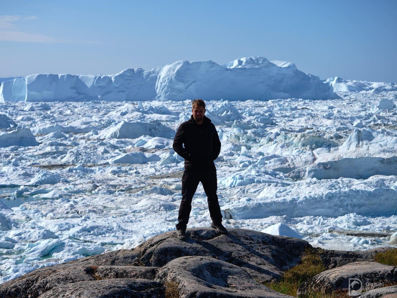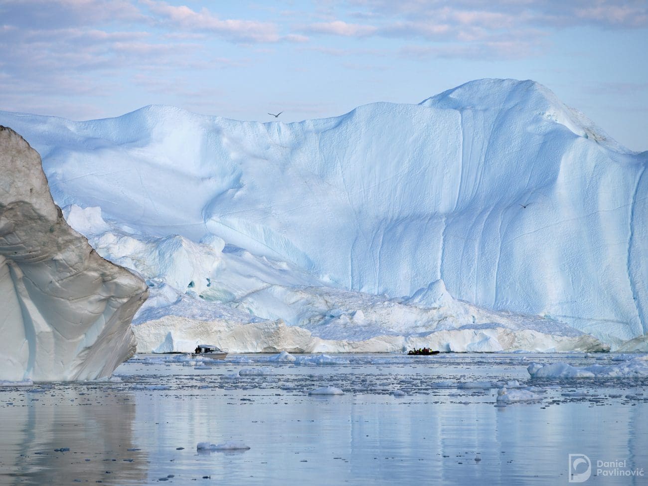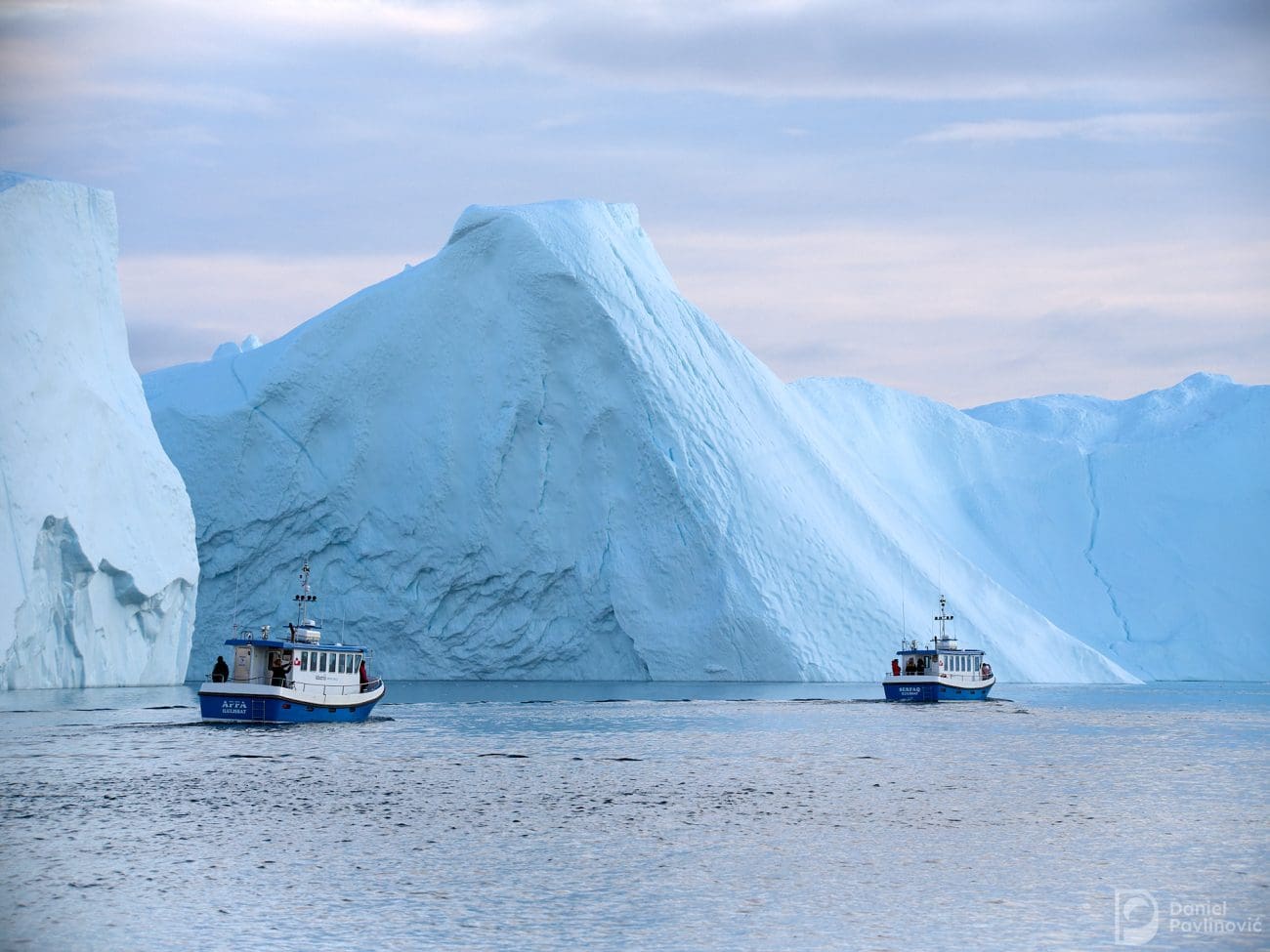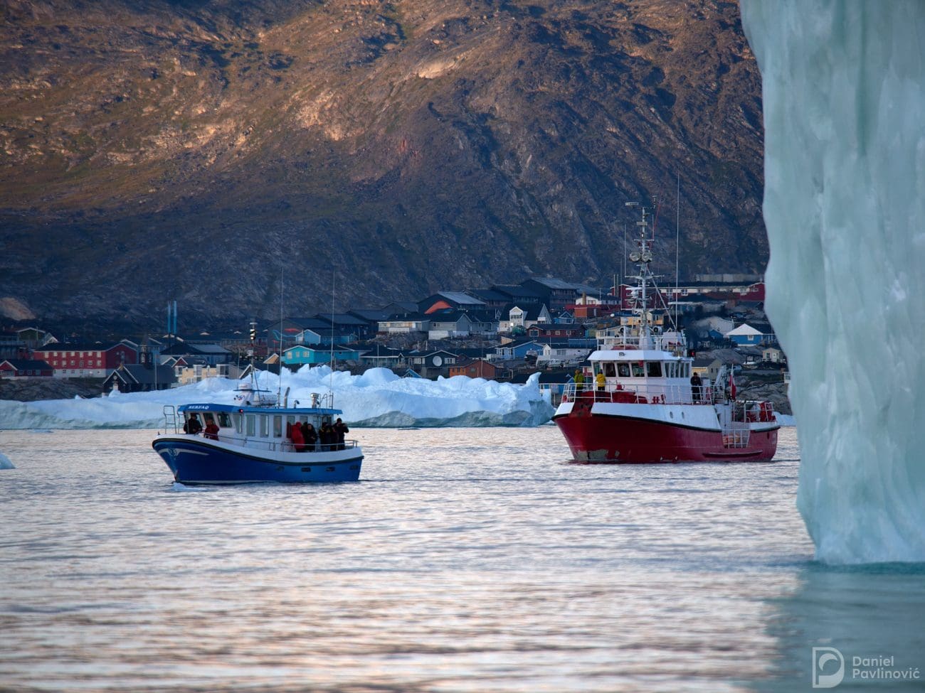 Dva sata s brzim čamcem obilazili smo područja koja u prvoj turi nisam obišao i pritom dosta pričali o životu na Grenlandu, rastu turizma, vremenu, kao i mjerljivom zatopljenju, povezanom s globalnim porastom temperature, zbog kojeg se led u tom području povlači, a sante gube na visini, osobito posljednjih dvadeset godina. Vrijeme je i ovaj put bila gotovo bonaca, iako ne potpuno sunčano, što mi je za fotografiju u ovo doba dana i odgovaralo.