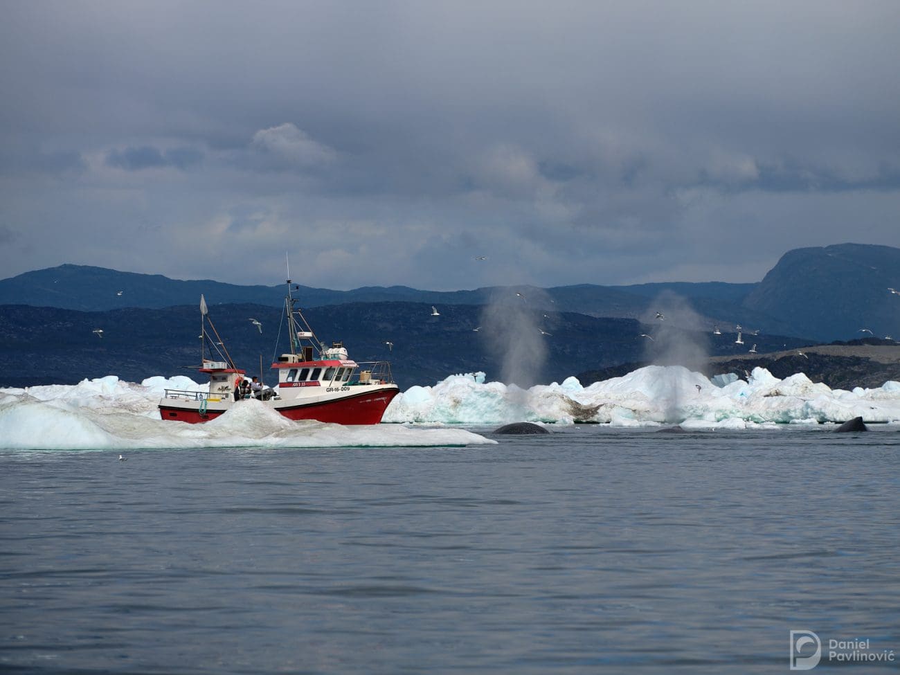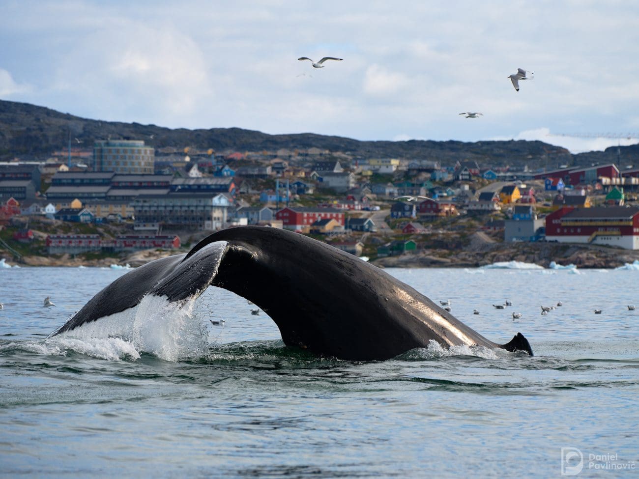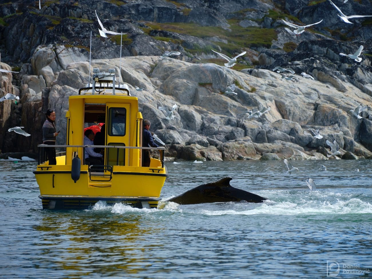 Pratimo kretnju galebova i kad se hrpa galebova naglo spusti na morsku površinu, to je mjesto gdje će se pojaviti jedan ili više kitova. Grbavi kitovi su ogromni, do 40 tona i 18 metara, i prilikom izrona prema površini iznesu sa sobom dosta hrane za galebove, koji se zatim zalijeću u to područje. Čim primijetimo takvo ponašanje galebova, gliser ide full speed prema njima i zaustavi se desetak metara dalje. Rezultat je bio da smo tijekom dva sata vidjeli vjerojatno 30-ak grbavih kitova, od kojih su neki izranjali odmah do glisera i preranjali nas. Jedan nas je prilikom ispuha čak i zaprskao morem. U sred ture odmorili smo se uz čašu toplog čaja. "Lov" na kitove bilo jedno od boljih iskustava u obje moje posjete Grenlandu. Nakon ture pošao sam u jedan azijski restoran, gdje sam za večeru jeo hranu koja je bila vrlo ljuta čak i za moj standard kao obožavatelja ljute hrane.