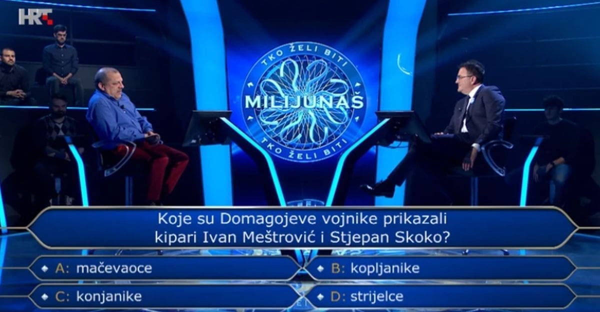 Lovro je zapeo na pitanju za 2.000 kuna. Nije znao koje su Domagojeve vojnike prikazali kipari Ivan Meštrović i Stjepan Skoko. Ponuđeni odgovori obuhvaćali su mačevaoce, kopljanike, konjanike te strijelce. Riječ je o strijelcima, naglasio je znalac Ivan pomogavši mu osvojiti spomenuti iznos.
