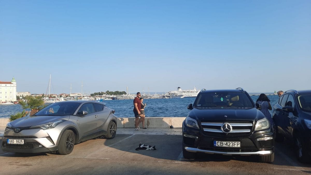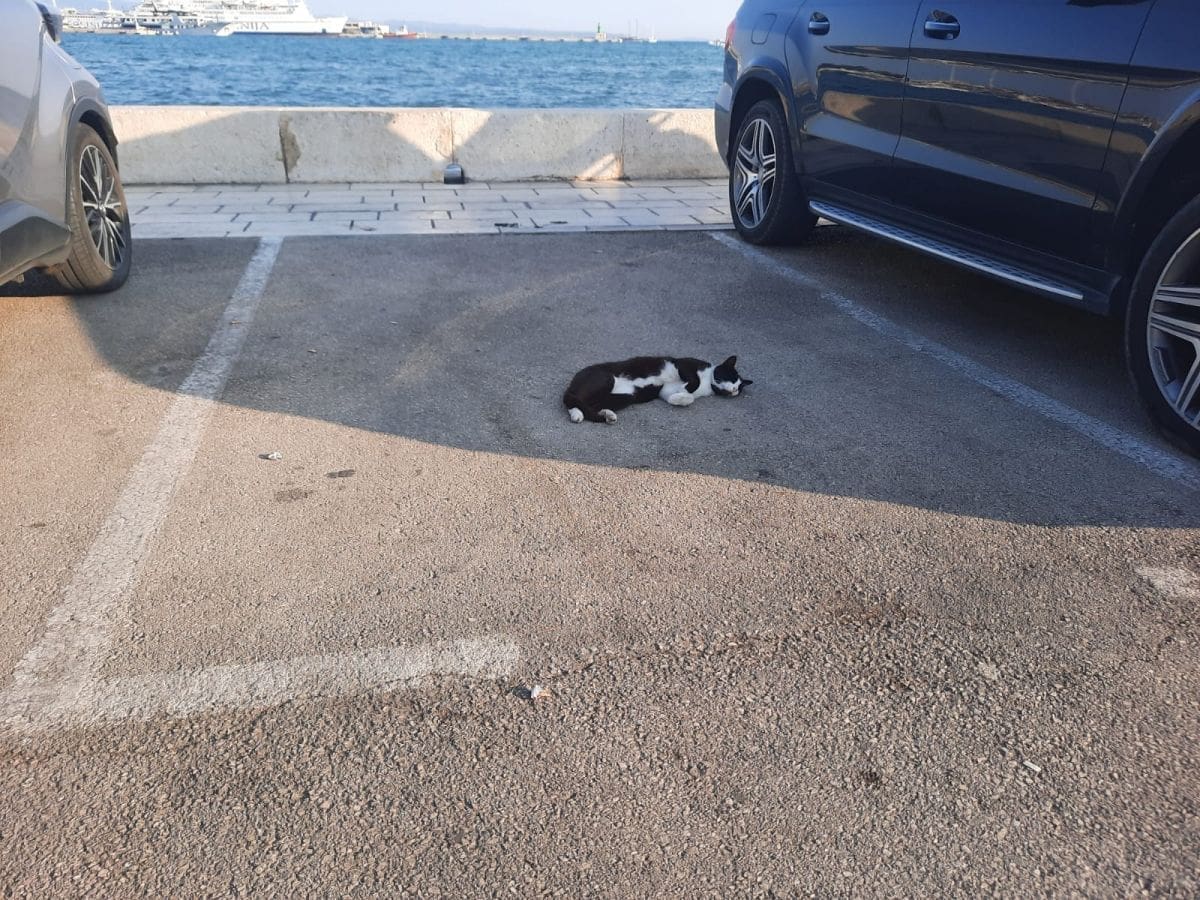 Od vrućine se najbolje rashladiti u moru, a alternativa je dobar hlad. A neobičan hlad pronašla je jedna splitska mačka. Naime, ona je stala na parkiralištu između Rive i Matejuške i to među dva automobila koja su joj stvorila hladovinu.