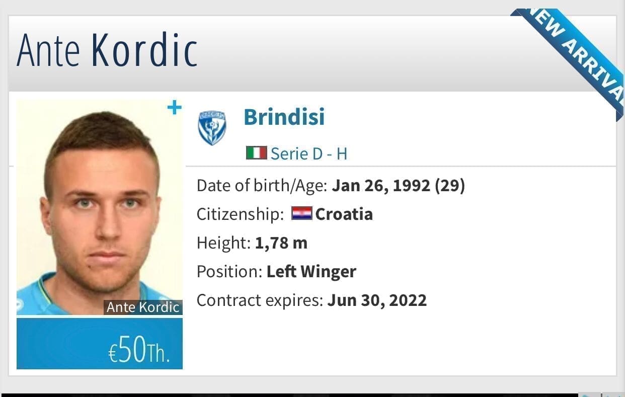 Ante Kordić, bivši igrač Dugopolja, Cibalije i Krškog, potpisao je za talijanski klub Brindisi koji se natječe u Serie D.