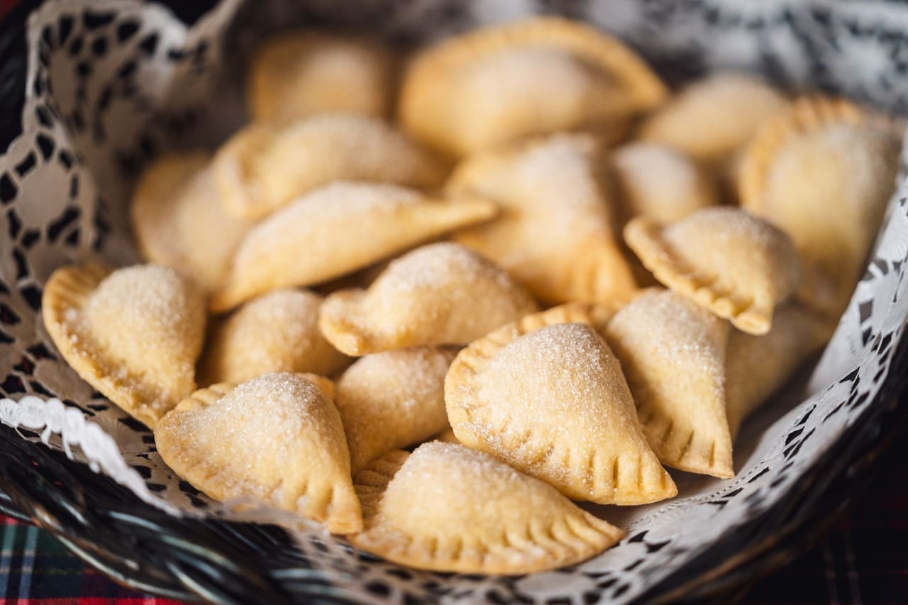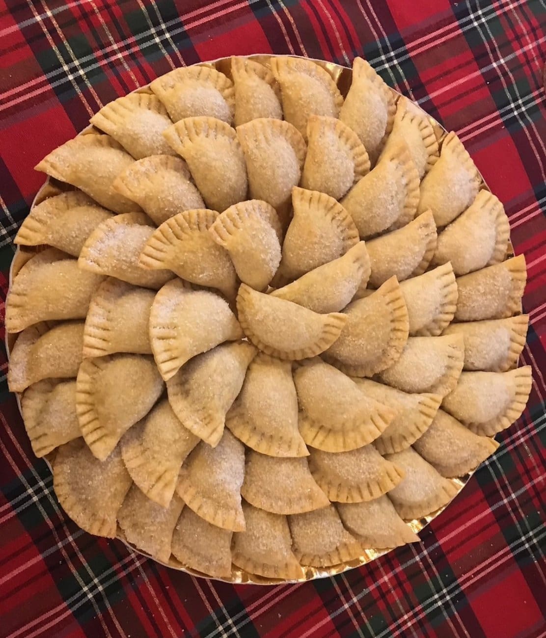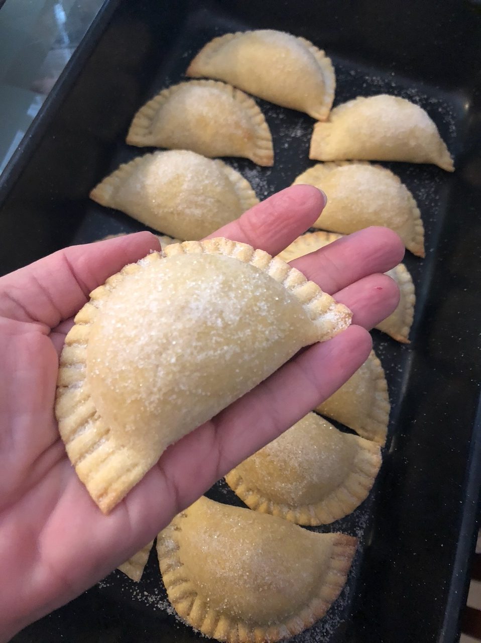 Tijesto provaljati kroz brašno, razvaljati ga u tanki list, rezačem izrezati krugove od 10 cm promjera, staviti žličicu i po smjese, preklopiti, stisnuti viljuškom po krajevima.