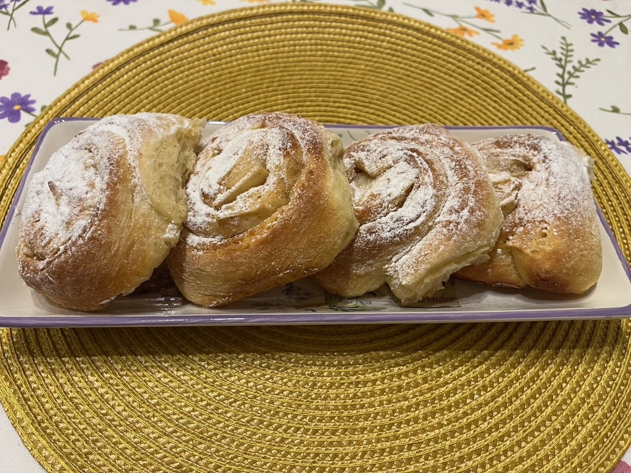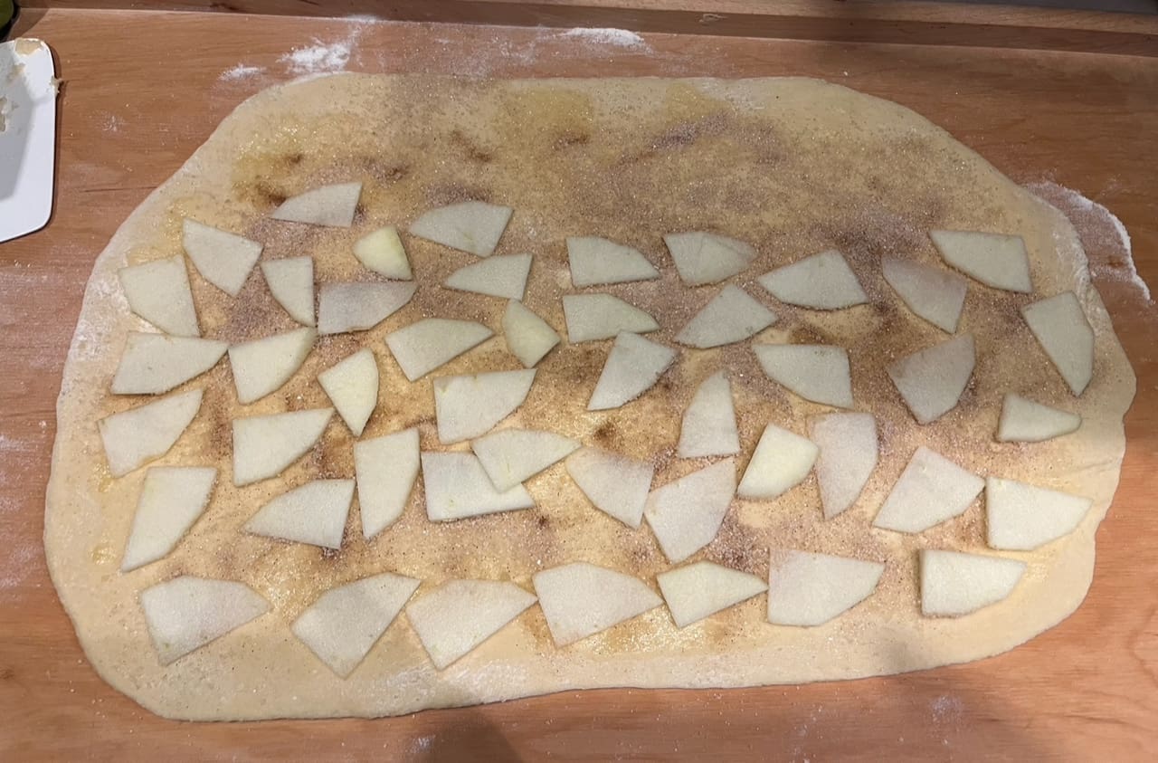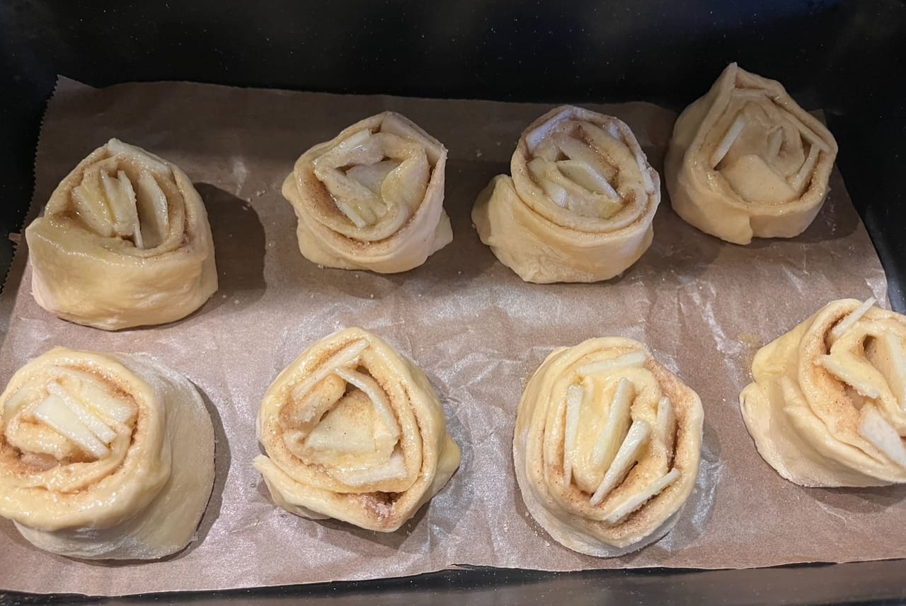 Jabuke narežite na vrlo tanke ploškice, cimet i šećer pomiješajte. Razvaljajte tijesto u pravokutnik, premažite ga otopljenim maslacem, pospite mješavinom šećera i cimeta i poslažite ploškice jabuka. Ostavite otprilike tri prsta pravokutnika bez jabuka. Zamotajte sve u rolu, kao da motate štrudel. Oštrim nožem izrežite role, debljine cca 3 cm. Poslažite ih na lim kojeg ste obložili papirom za pečenje. Obično ostane otopljenog maslaca s kojim ste premazali tijesto pa ja još premažem tim ostatkom vrhove rola. Ostavite ih da još malo miruju, otprilike pola sata. U zagrijanu pećnicu na 180 C pecite ih dok ne porumene, otprilike 25-30 minuta.