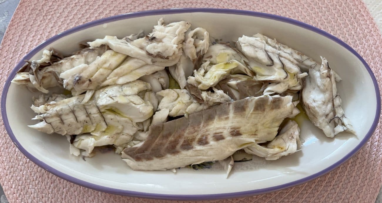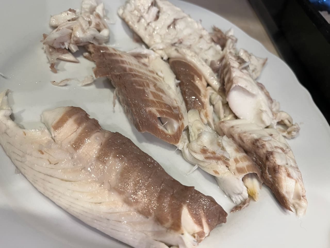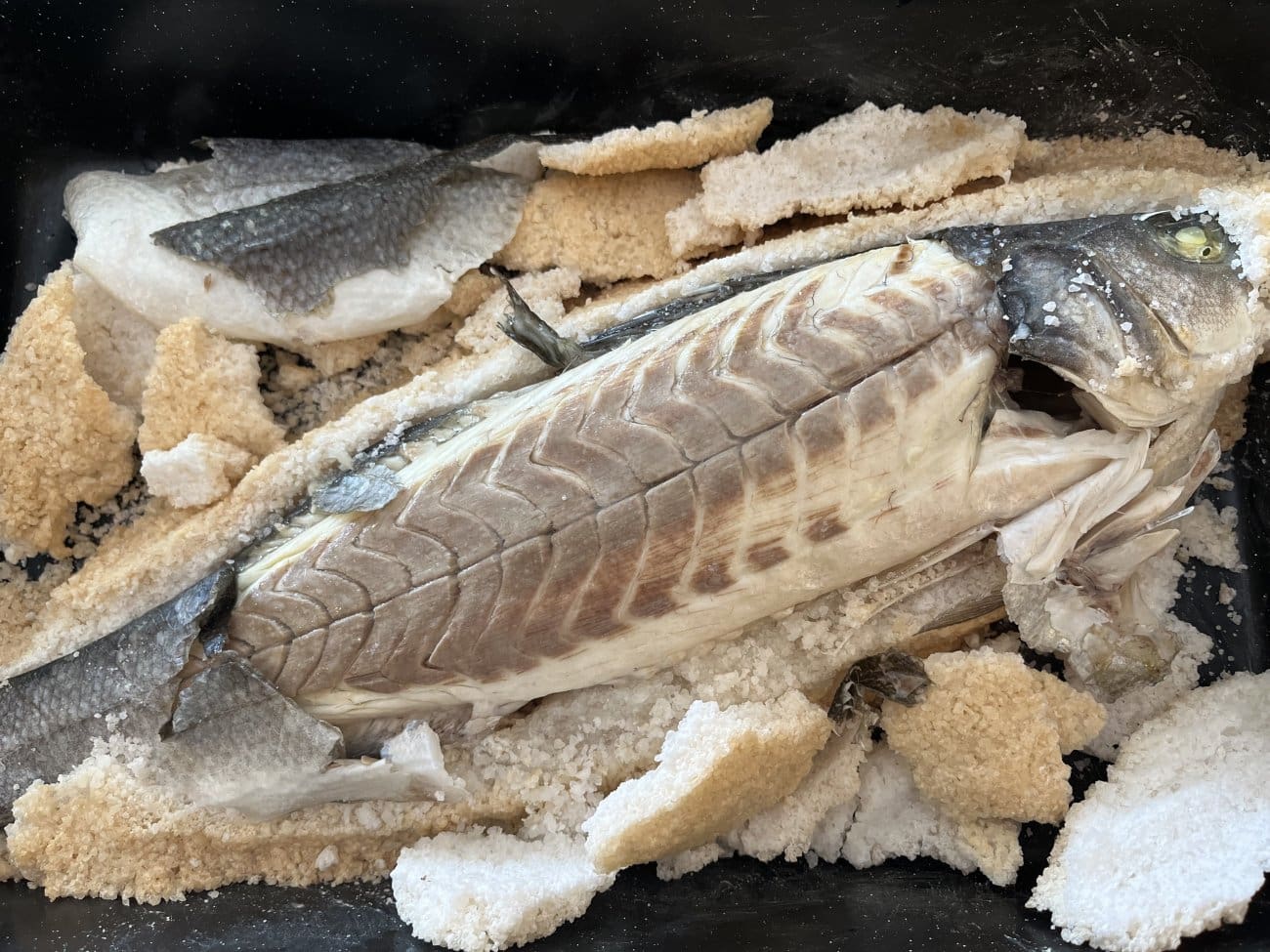 Mora vam se po površini napraviti smećkasta kora. Izvadite I ostavite desetak minuta da stane, a onda taj okop od soli istucite, ja to radim batom za meso. Sva koža od ribe će se lijepo skinuti, a vi imate zadatak samo izvaditi najsočnije meso vaše ribe, staviti na tanjur i zaliti dobrim maslinovim uljem.