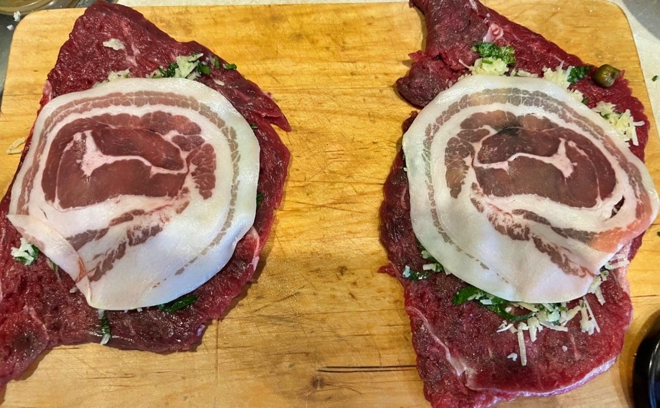 U sredinu odreska stavite par kapara i prekrijte fetom pancete, te zarolajte u smotuljak. Učvrstite čačkalicom.