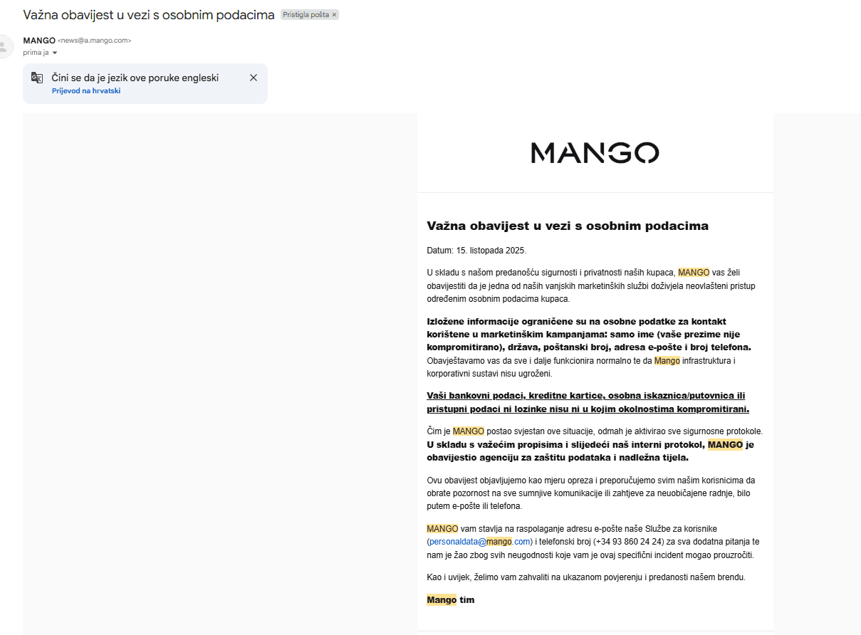 Korisnici trgovine MANGO u Hrvatskoj primili su e-mail obavijest da je jedna od vanjskih marketinških službi doživjela neovlašteni pristup dijelu osobnih podataka. Kompromitirani su ime, e-mail, broj telefona i poštanski broj. Bankovni podaci, lozinke i identifikacijski dokumenti nisu ugroženi.