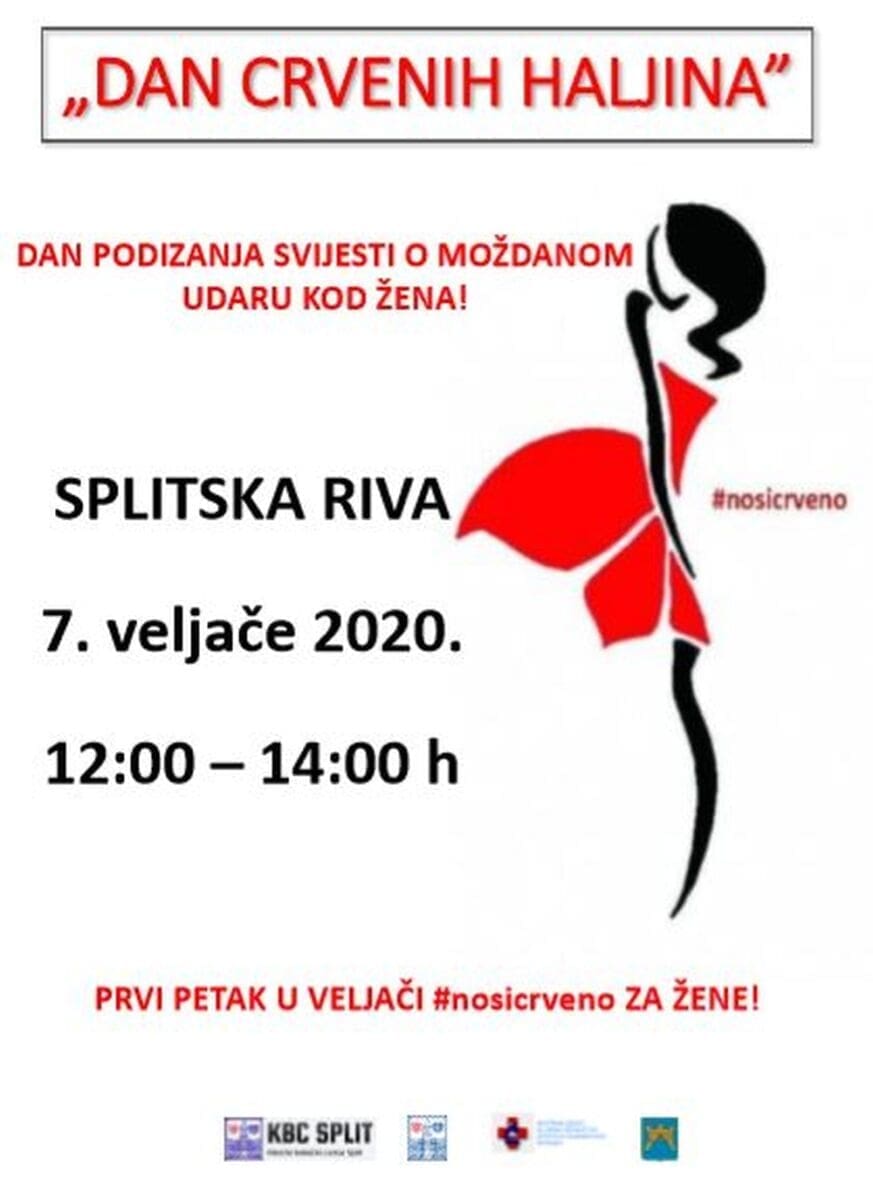 Nastavni zavod za javno zdravstvo SDŽ i Klinika za neurologiju KBC Split organiziraju javnozdravstvenu akciju povodom obilježavanja Dana crvenih haljina 2020. godine. Cilj akcije je podizanje svijesti javnosti o specifičnostima moždanog udara kod žena, skretanje pozornosti na pogubne posljedice zanemarivanja simptoma i na potrebu promjena načina života.