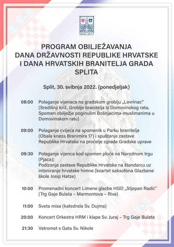 Obilježavanje Dana državnosti Republike Hrvatske i Dana hrvatskih branitelja grada Splita, 30. svibnja 2022. godine, započet će polaganjem vijenaca na gradskom groblju Lovrinac u 8 sati kod Središnjeg križa, zatim na Groblju branitelja iz Domovinskog rata te kod Spomen obilježja poginulim Bošnjacima-muslimanima u Domovinskom ratu.