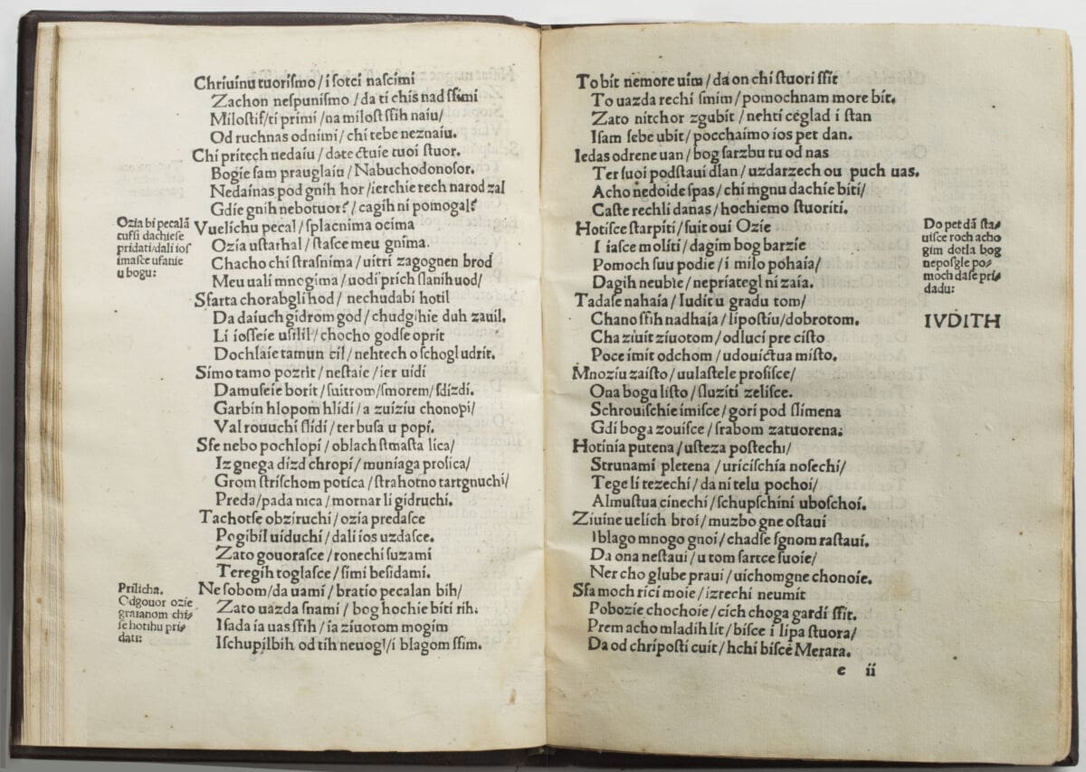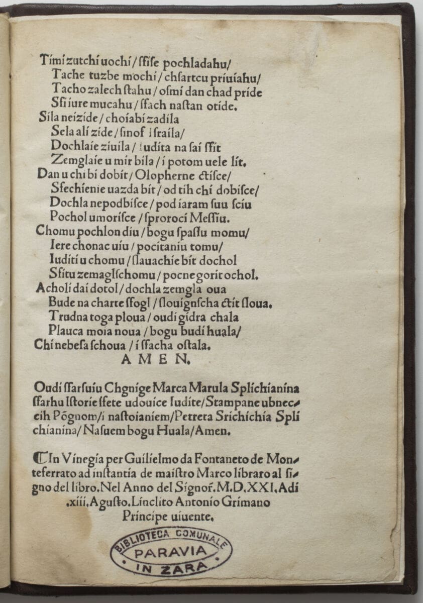 - travnja je Dan hrvatske knjige u spomen na datum kada je Marko Marulić Splićanin prije točno 520 godina dovršio ep Judita ispjevan na hrvatskom jeziku. U invokaciji Judite Marulić zaziva Božju pomoć i nadahnuće, a u posveti svome kumu i prijatelju don Dujmu Balistriliću navodi: "…ulize mi u pamet da ju stumači(m) naši(m) jaziko(m), neka ju budu razumiti i oni ki nisu naučni knjige latinske aliti djačke."