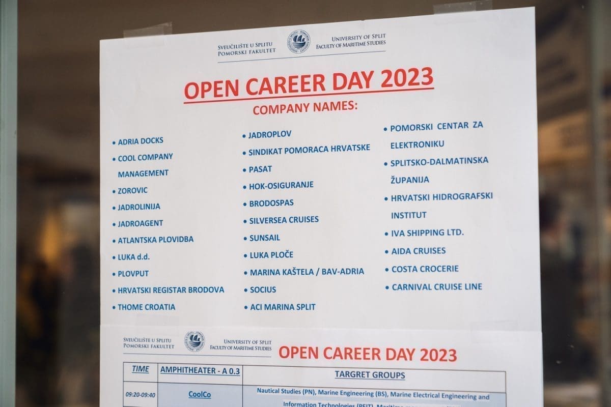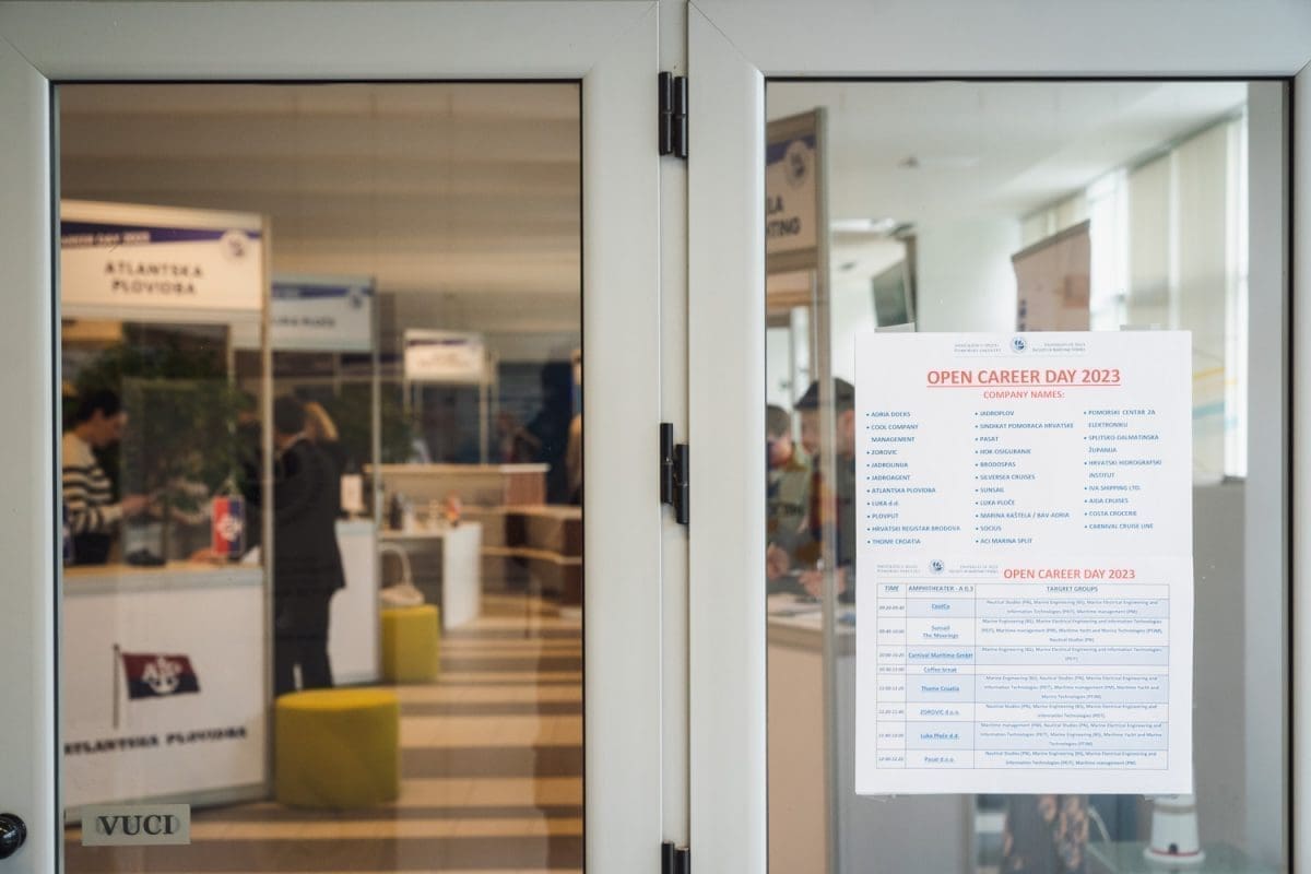 Sjajne vijesti stižu s Dana karijera (Open Career Day) 2023. Studenti (nautike, brodostrojarstva, elektrotehnike i informatičkih tehnologija, pomorskog menadžmenta i pomorskih tehnologija jahti i marina) Pomorskog fakulteta u Splitu, danas su imali priliku izravno komunicirati s 28 tvrtki iz svijeta pomorstva.