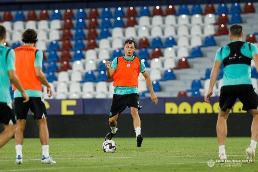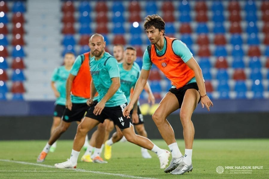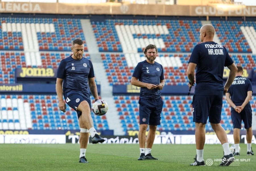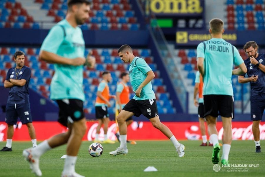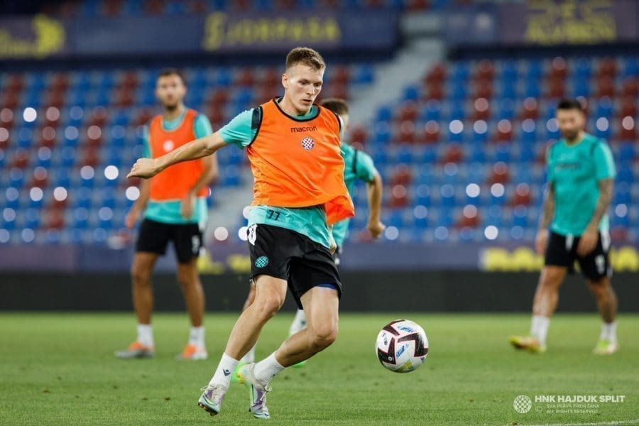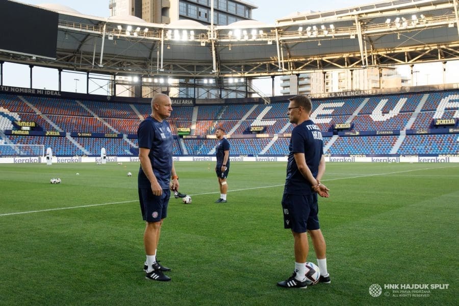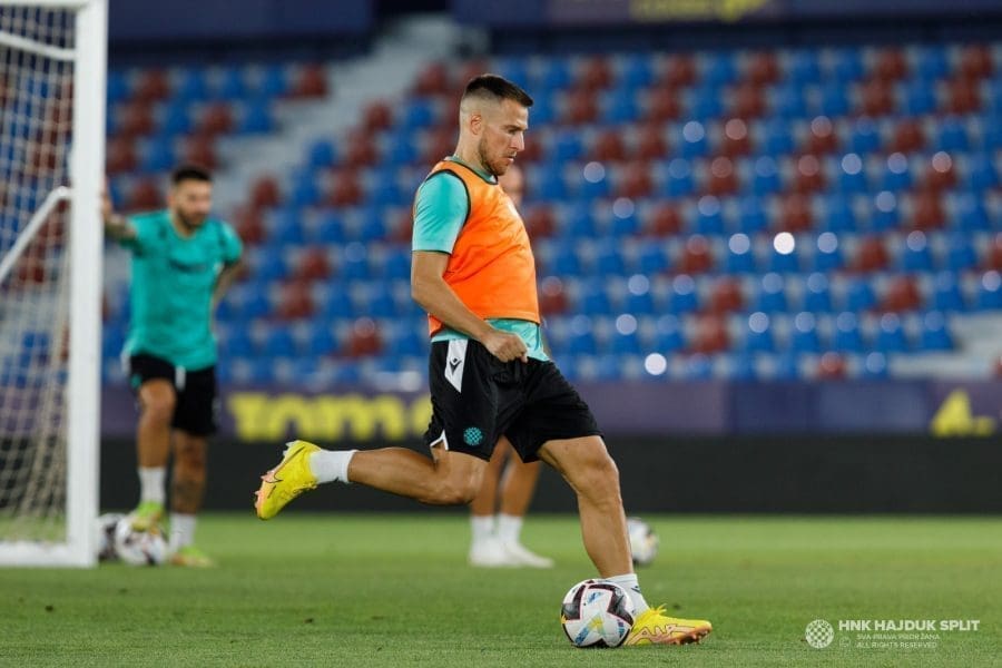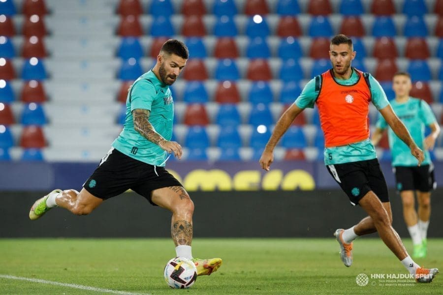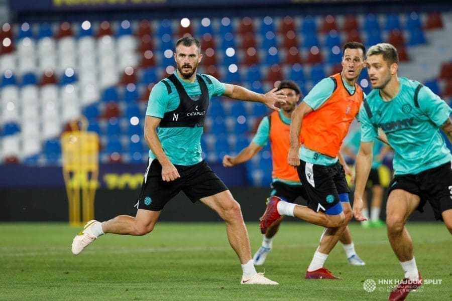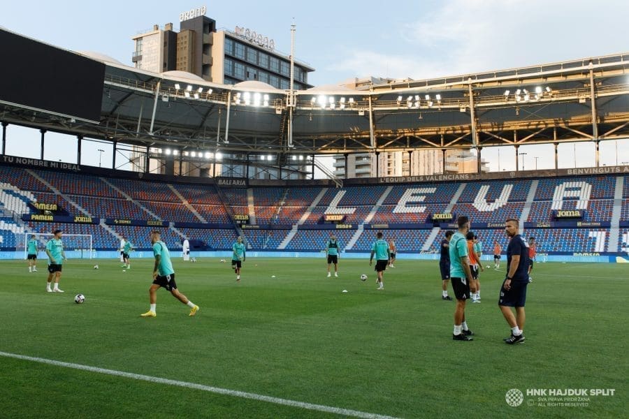 Odradili su nogometaši Hajduka večeras i službeni trening na stadionu Ciutat de Valencia, posljednji uoči prvog dvoboja Play-offa Konferencijske lige protiv španjolskog Villarreala. Trening je, sukladno UEFA-inom protokolu, trajao sat vremena u domu Levantea.