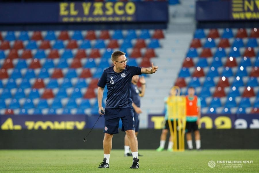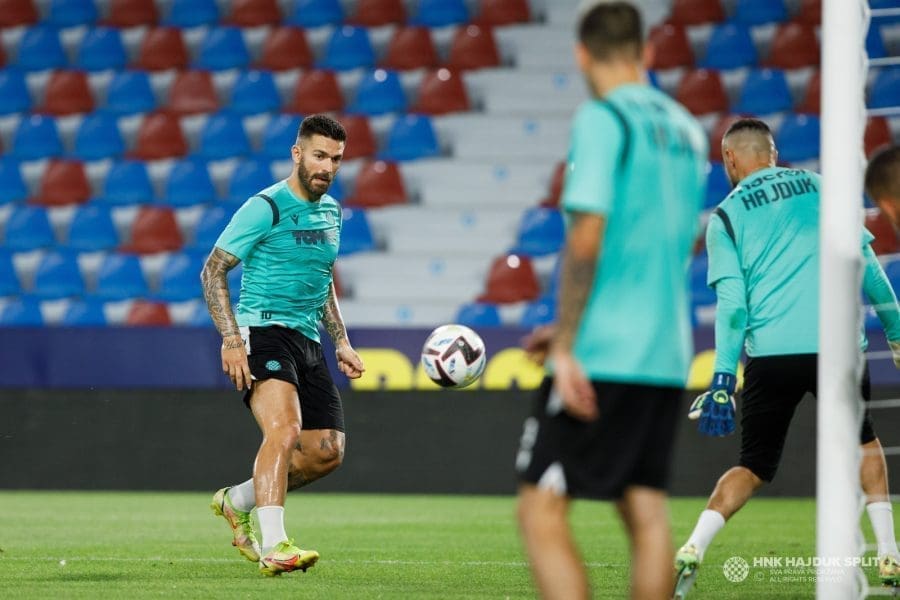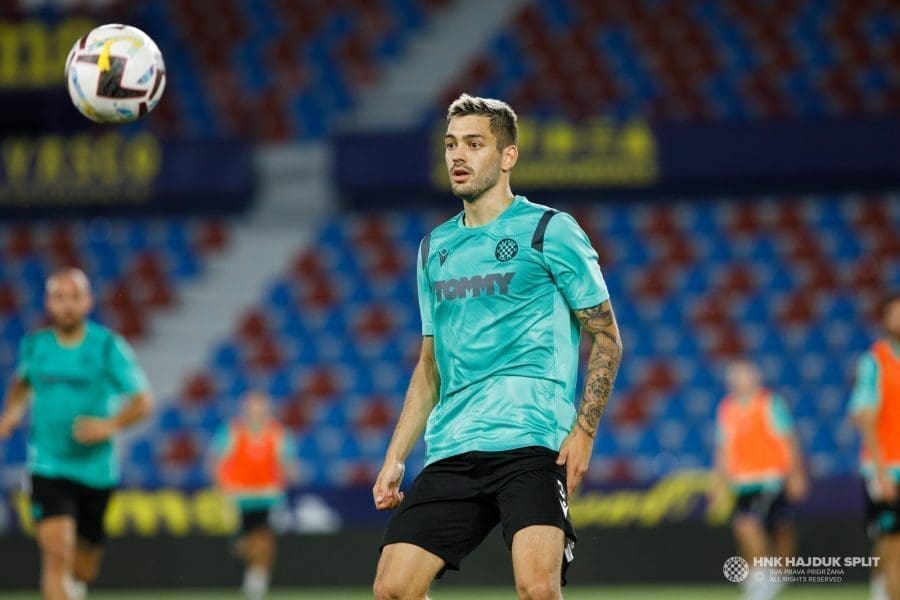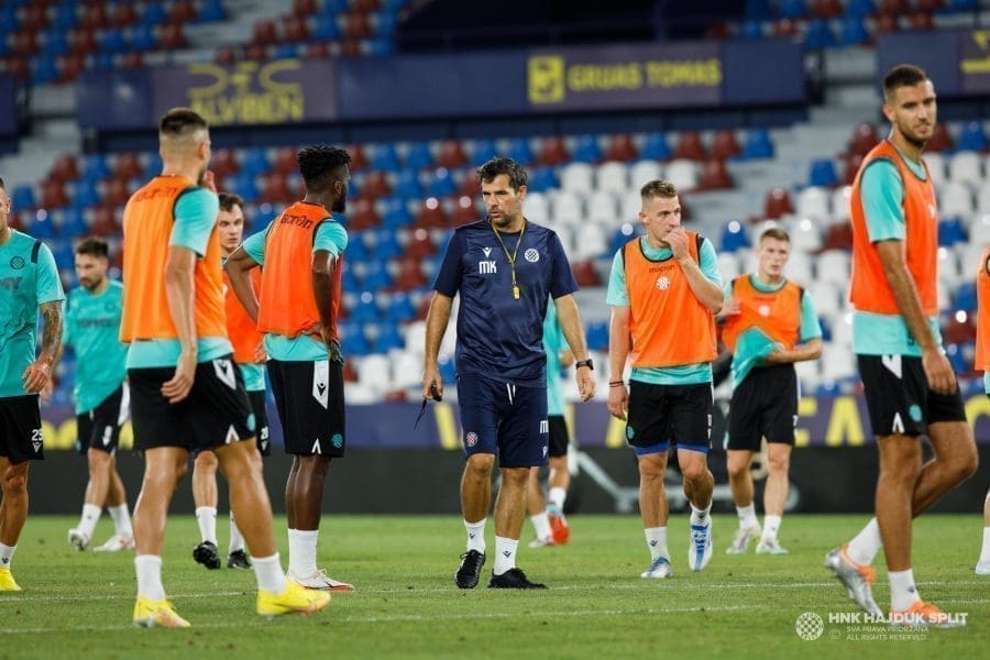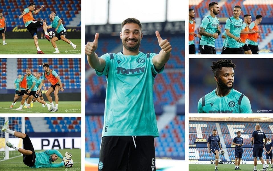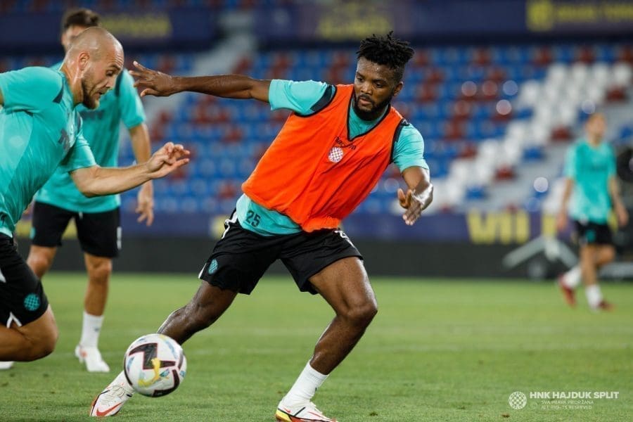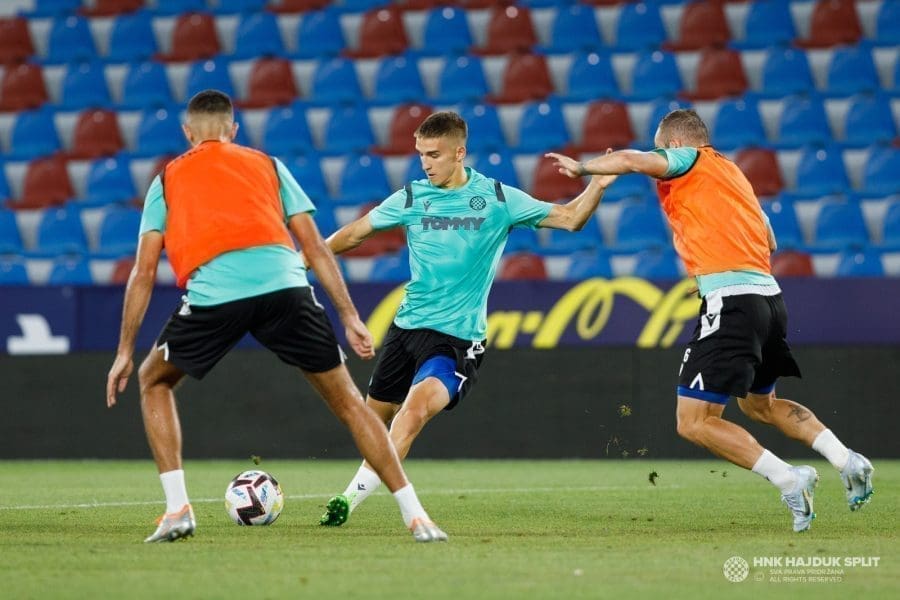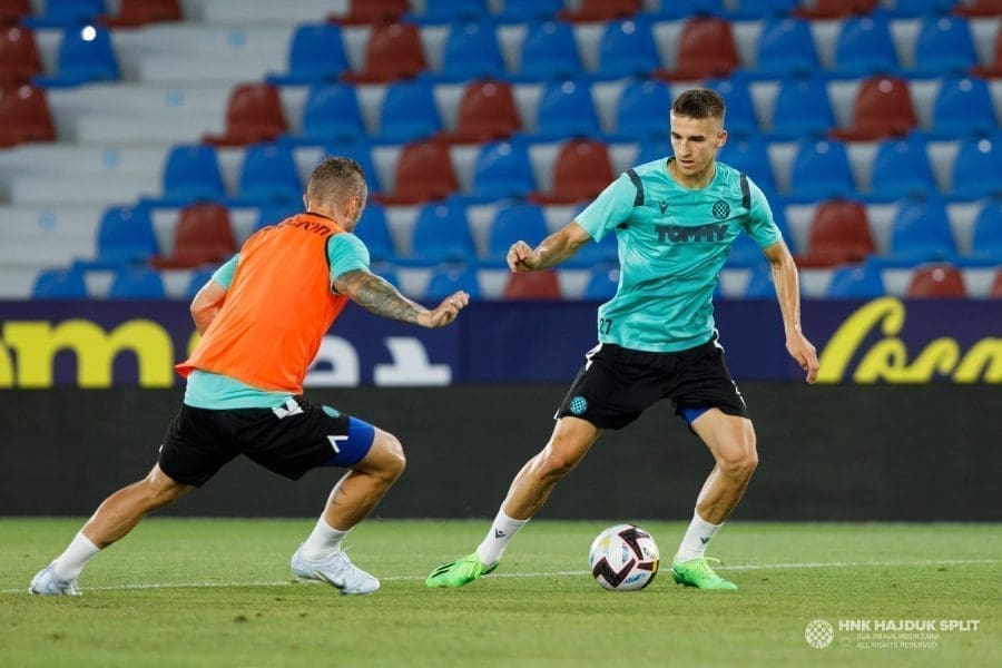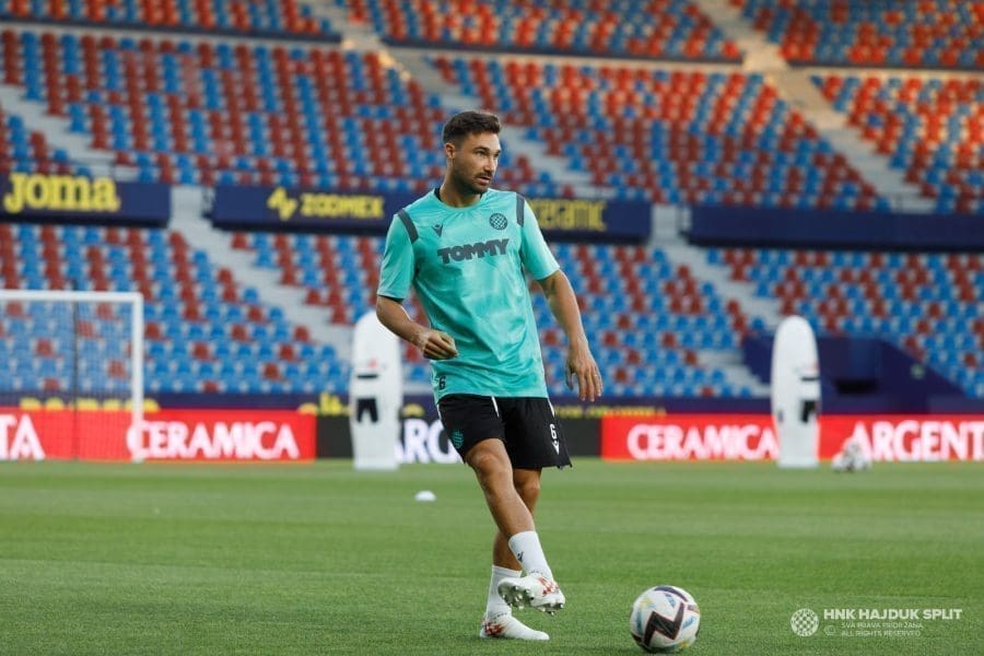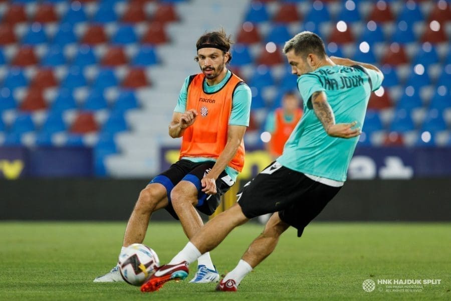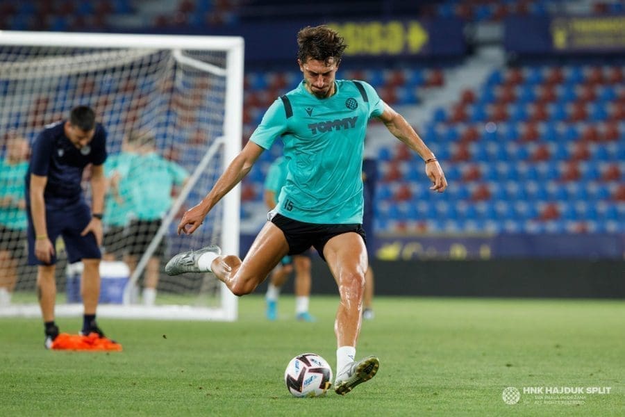 Odradili su nogometaši Hajduka večeras i službeni trening na stadionu Ciutat de Valencia, posljednji uoči prvog dvoboja Play-offa Konferencijske lige protiv španjolskog Villarreala. Trening je, sukladno UEFA-inom protokolu, trajao sat vremena u domu Levantea.